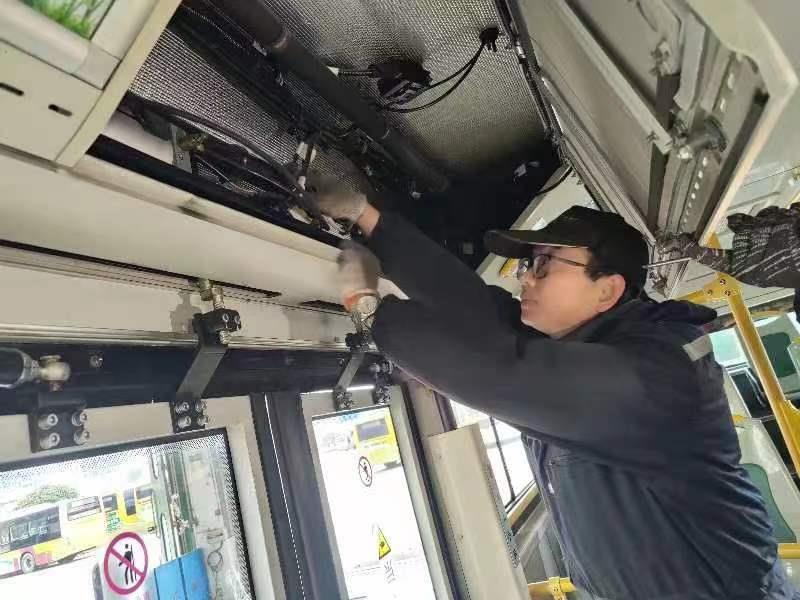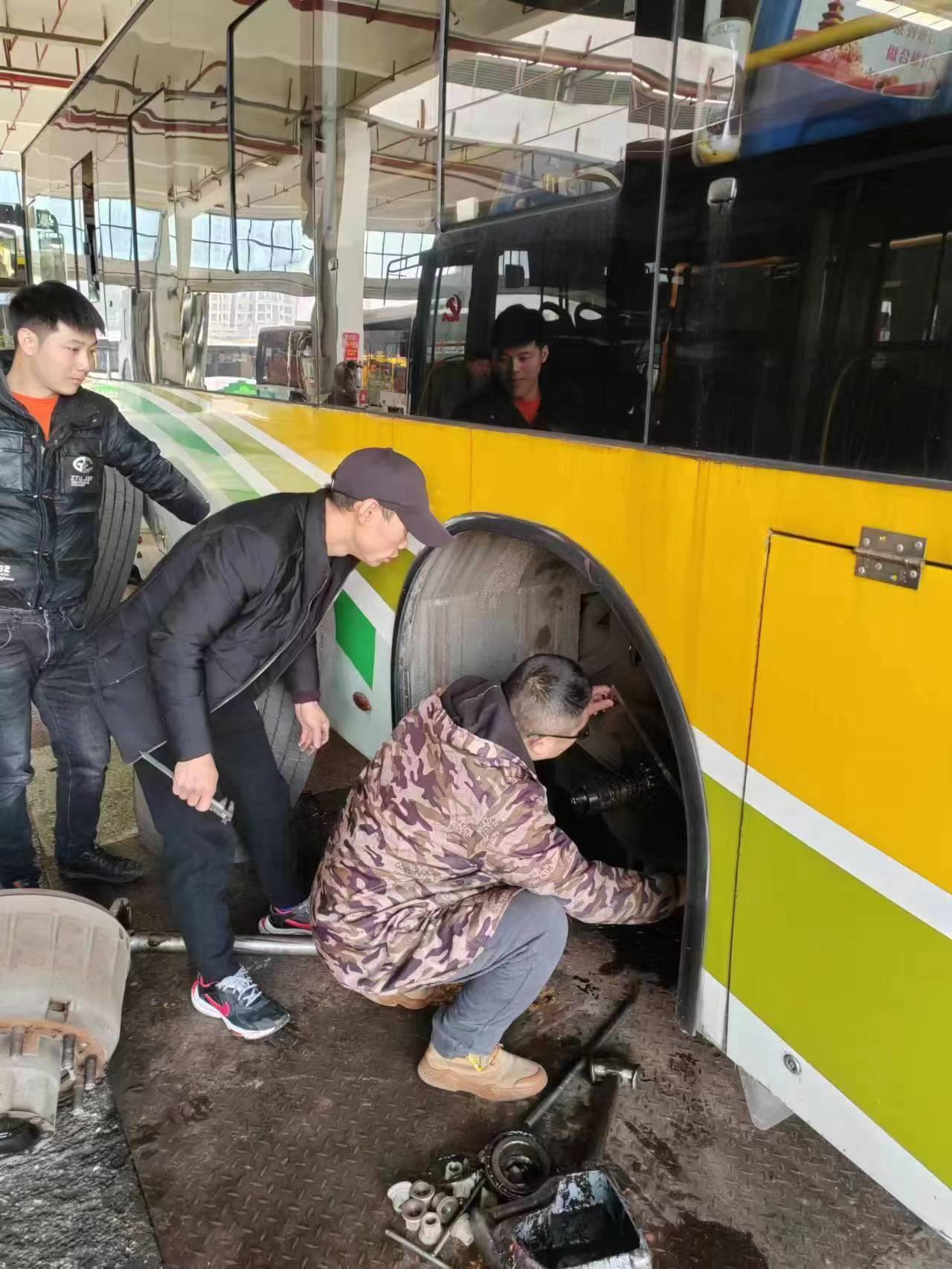 除夕当天,在市公交集团车辆维修中心,维修师傅们正忙着对故障车辆进行检修。尽管天气寒冷,但师傅们额头上已渗出了汗珠。技术科长沈晋衡拿着维修工具对车辆进行查看,确认车辆无故障后,高兴地将车辆交还给驾驶员。