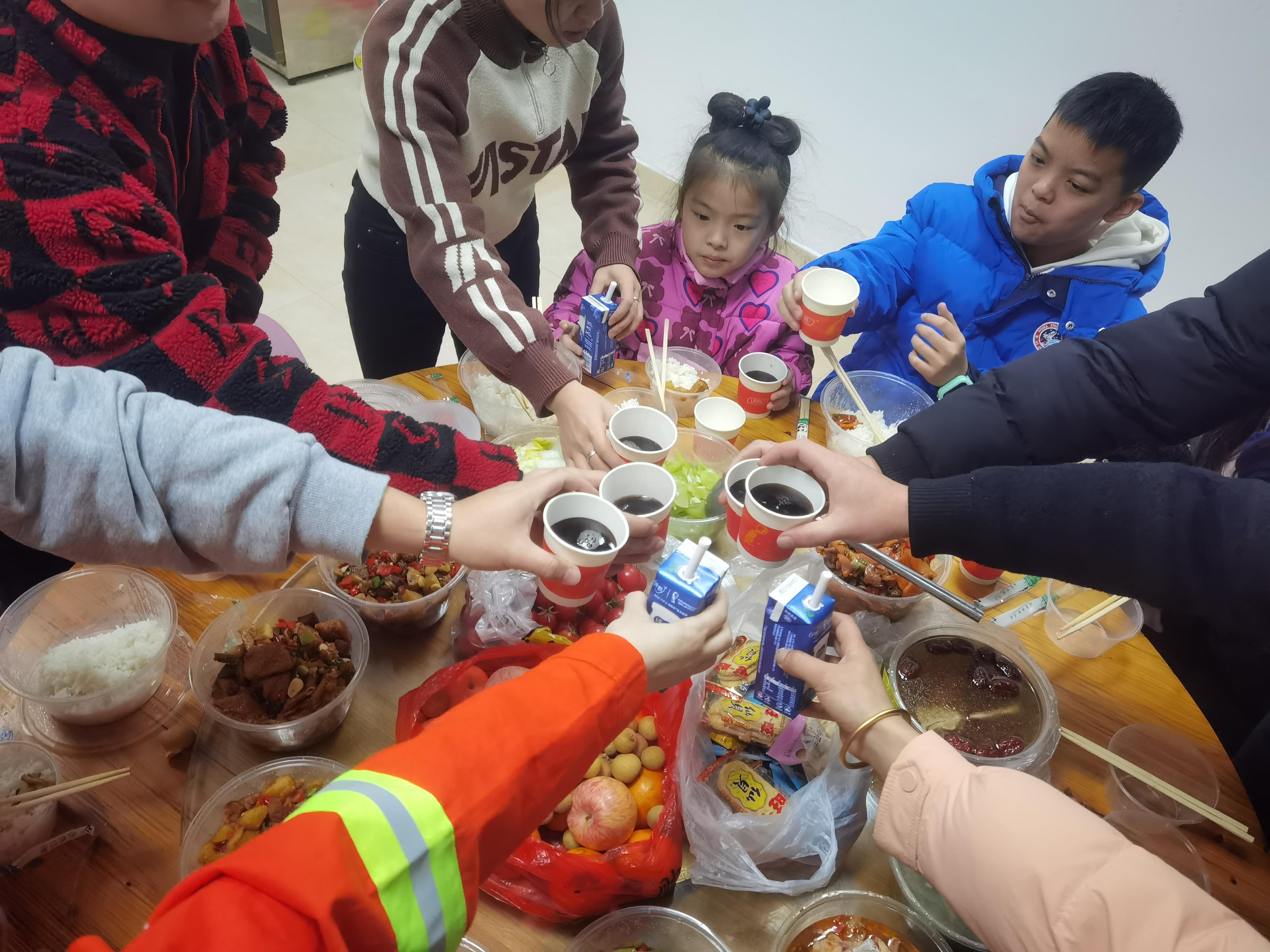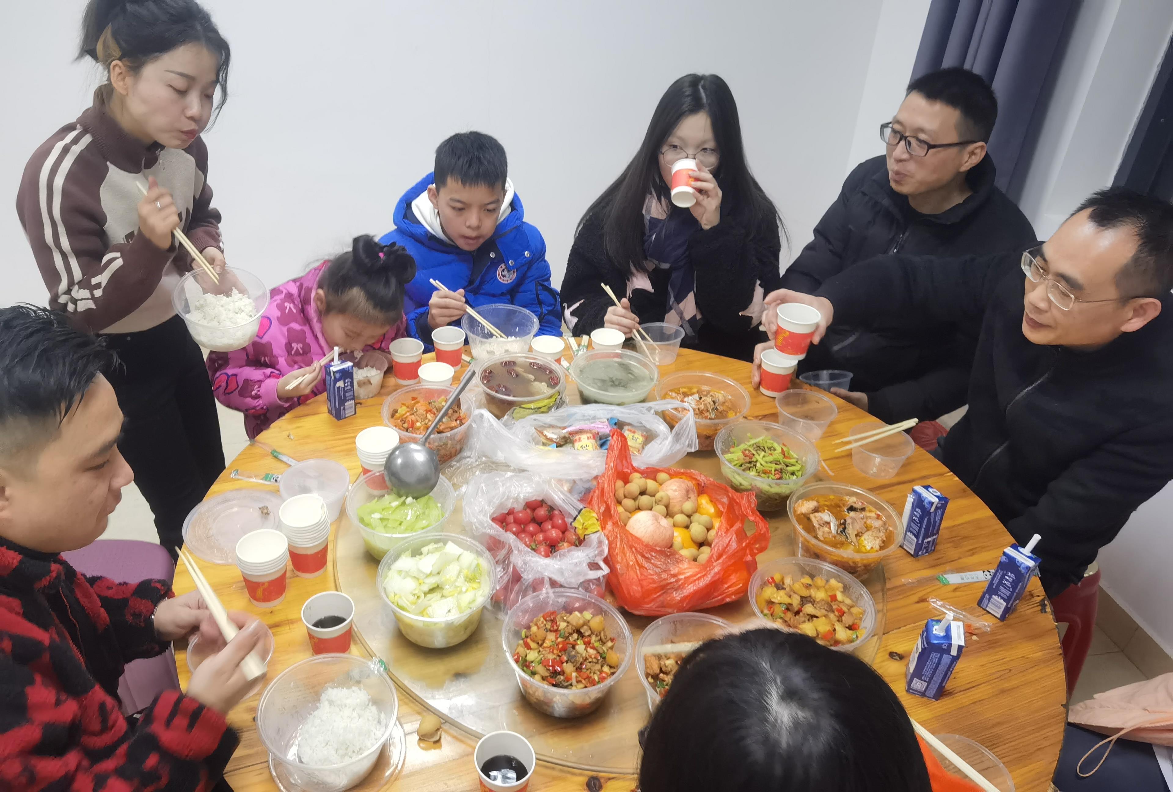 因为工作性质的原因,隧道管理所的大部分工作人员无法回家与家人一起过年团聚。下午5点半,晚饭时间到了,一场特殊的年夜饭在隧道所开吃,领导们邀请值班人员的家属也来到现场,大家一起吃着打包的盒饭,沉浸在新年的喜悦中。