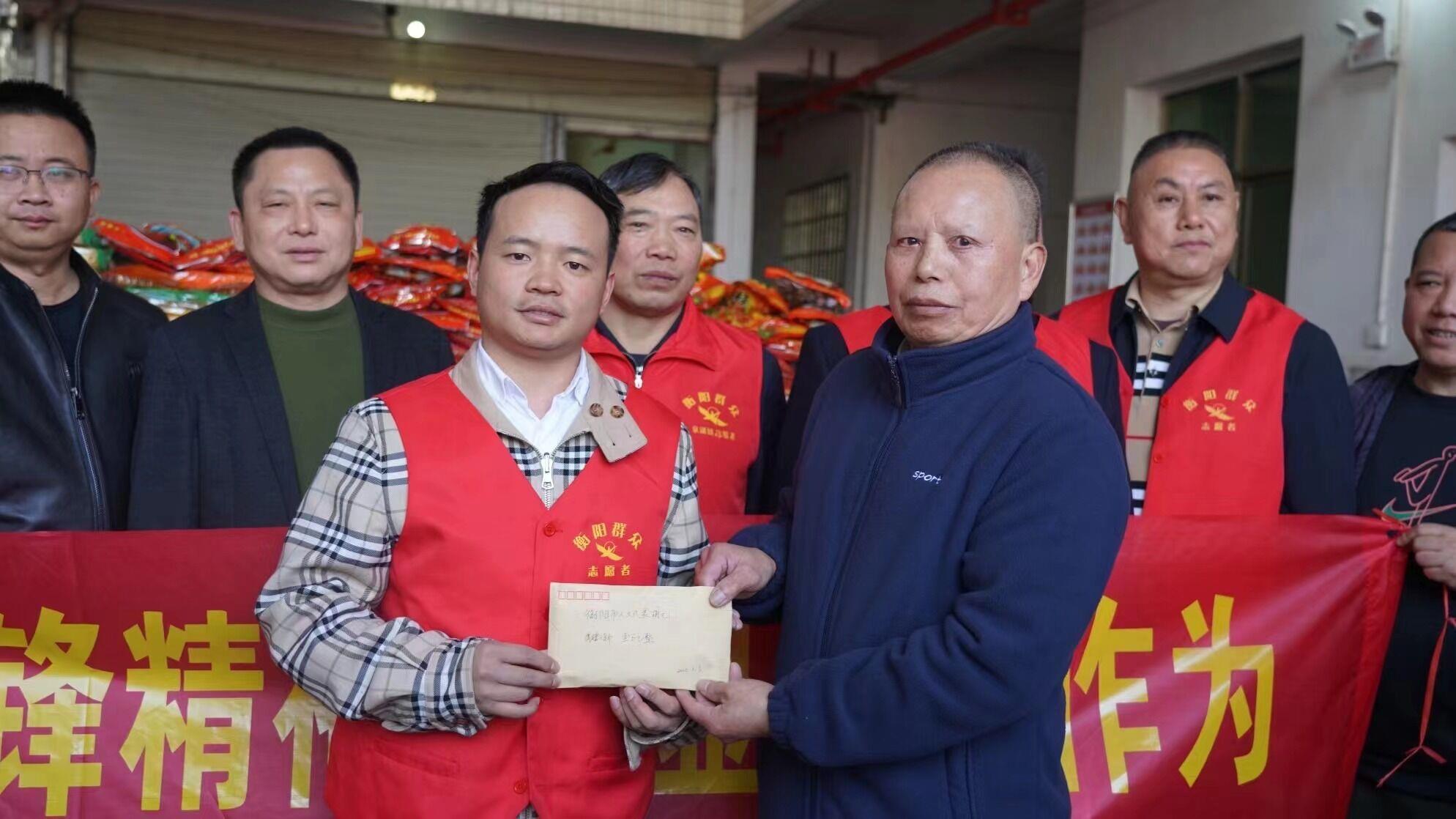 2022年,他在衡南县泉湖镇敬老院参加公益活动时,得知蒋铁生的弟弟患有严重的类风湿关节炎,仅仅靠着低保维持生活,因为凑不齐费用,手术一直拖着没做。他二话不说,立刻拿出一万元帮助老人。