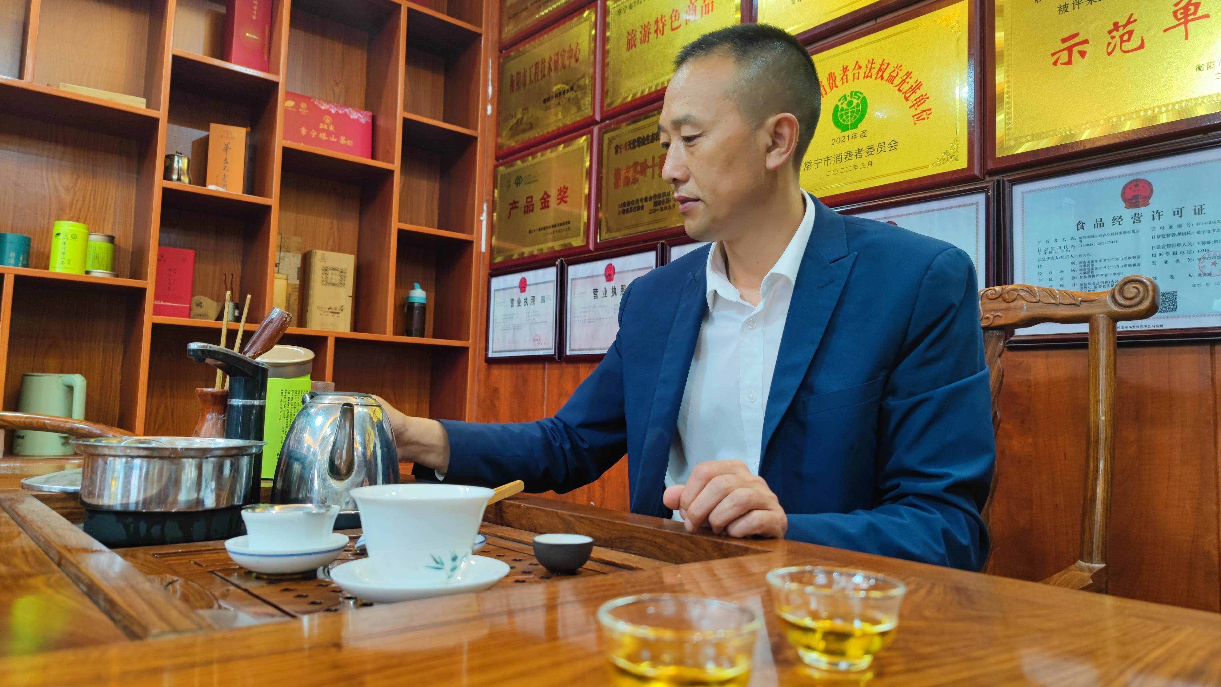 2014年,从狮园村走出的何万忠搁下代理饮品和房地产开发生意,回到家乡常宁市塔山瑶族乡,从35亩茶园开始,大力发展茶产业,带领当地村民增收致富。