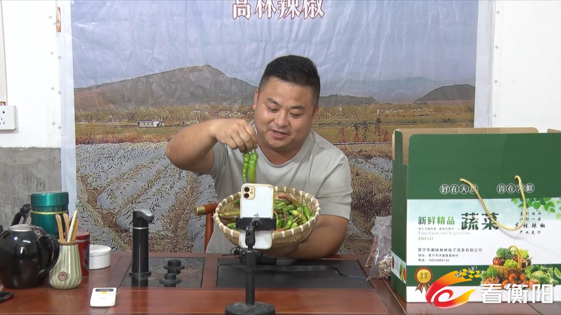 在常宁市洋泉镇高林村湘妹林林电子商务有限公司的直播带货工作室里,村民黄福兵捧着一盘新鲜的辣椒向网民介绍其特点。随着当前村里及周边的辣椒大量丰收,黄福兵的辣椒加工厂和直播室里忙碌了起来。他告诉记者,目前电商平台上一天可以卖出2000多斤辣椒产品,基本上每天供不应求。