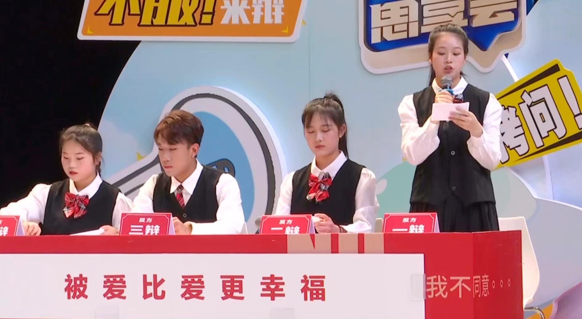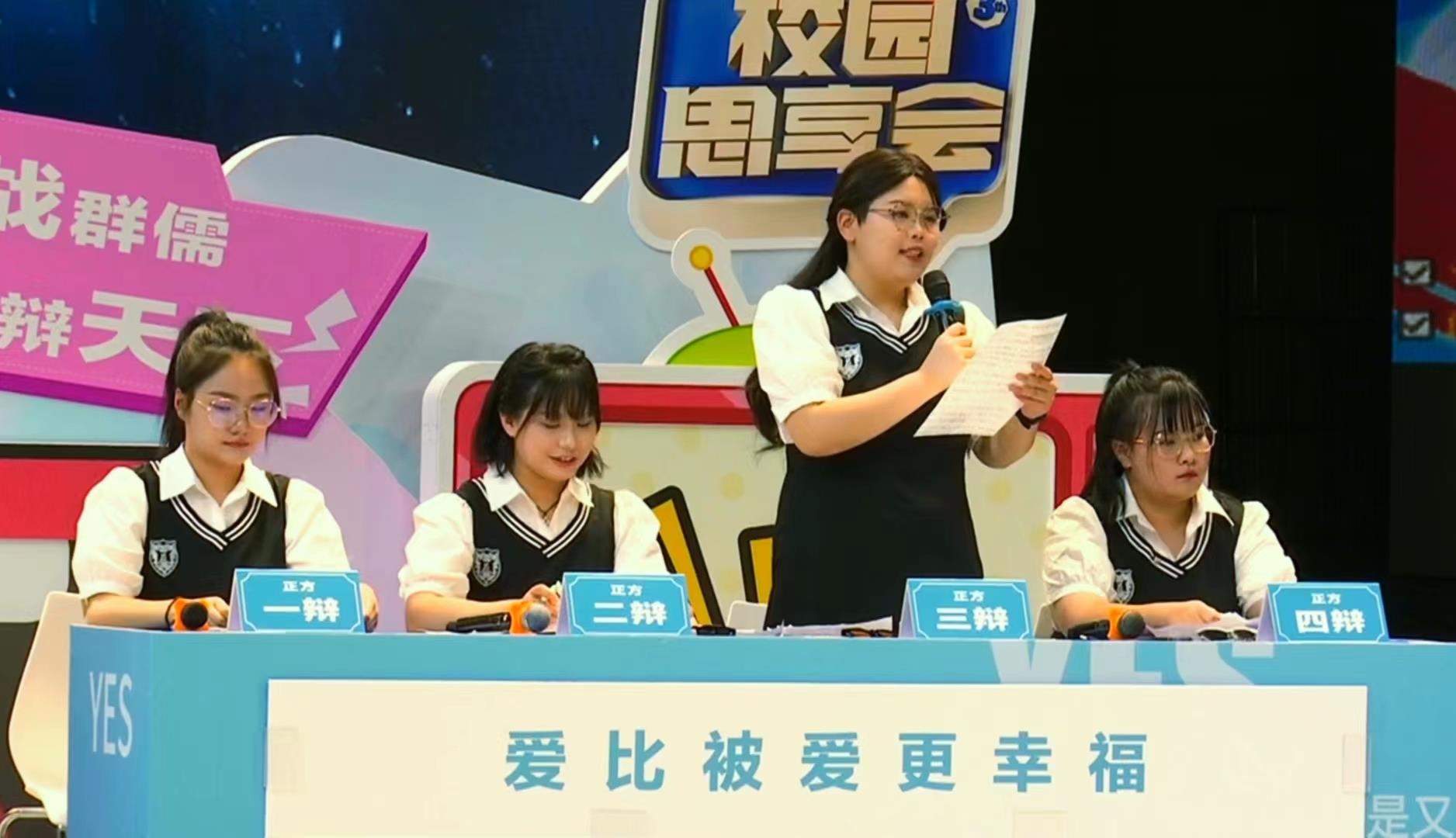 正方湖南财经工业职业技术学院代表队和反方衡阳技师学院代表队就“爱比被爱更幸福还是被爱比爱更幸福”这一辩题展开激烈的辩论。