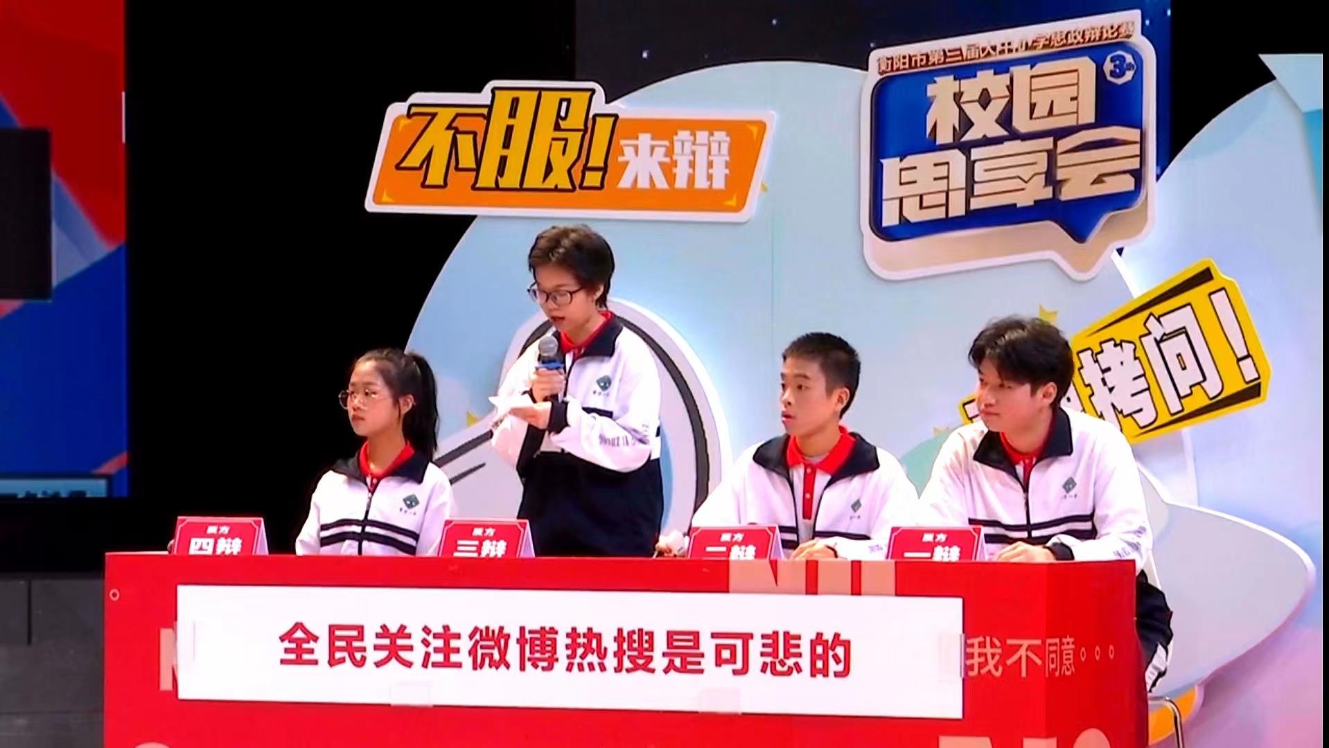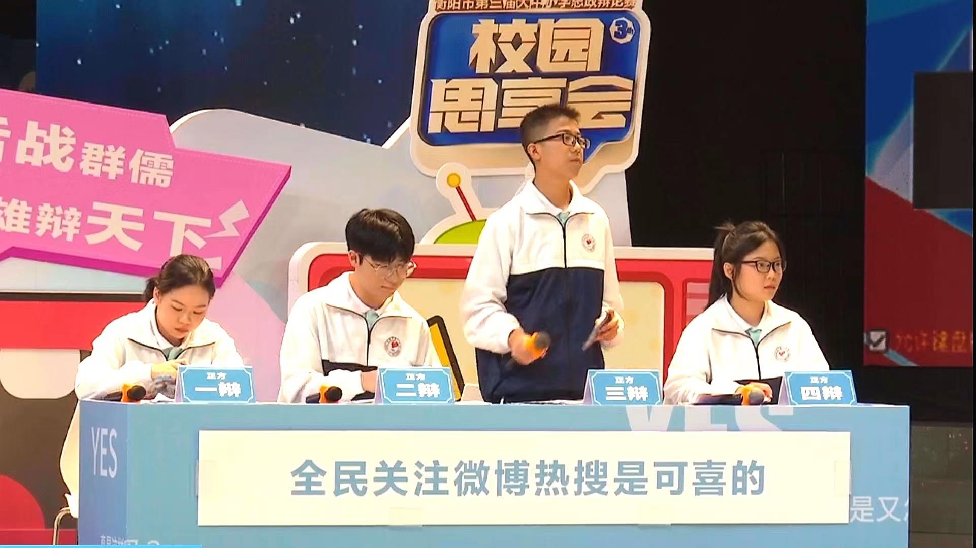 正方耒阳市一中代表队和反方常宁市一中代表队就“爱全民关注微博热搜是可喜的还是可悲的?”这一辩题展开激烈的交锋。