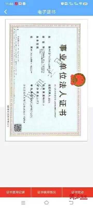 事业单位法人电子证书是按照统一标准规范核发的载有事业单位法人登记信息的电子证件,电子证书与现行纸质法人证书并行使用,具有同等法律效力,在使用和管理上更加高效便捷、安全可靠。随着事业单位法人电子证书应用场景的拓展和完善,事业单位在办理需要查验事业单位法人身份的事项时,可通过“湘事登App”出示电子证书作为身份验证的依据,实现“掌上亮证”,提升办理相关政务、公共服务等业务的服务效率和便利化水平。
