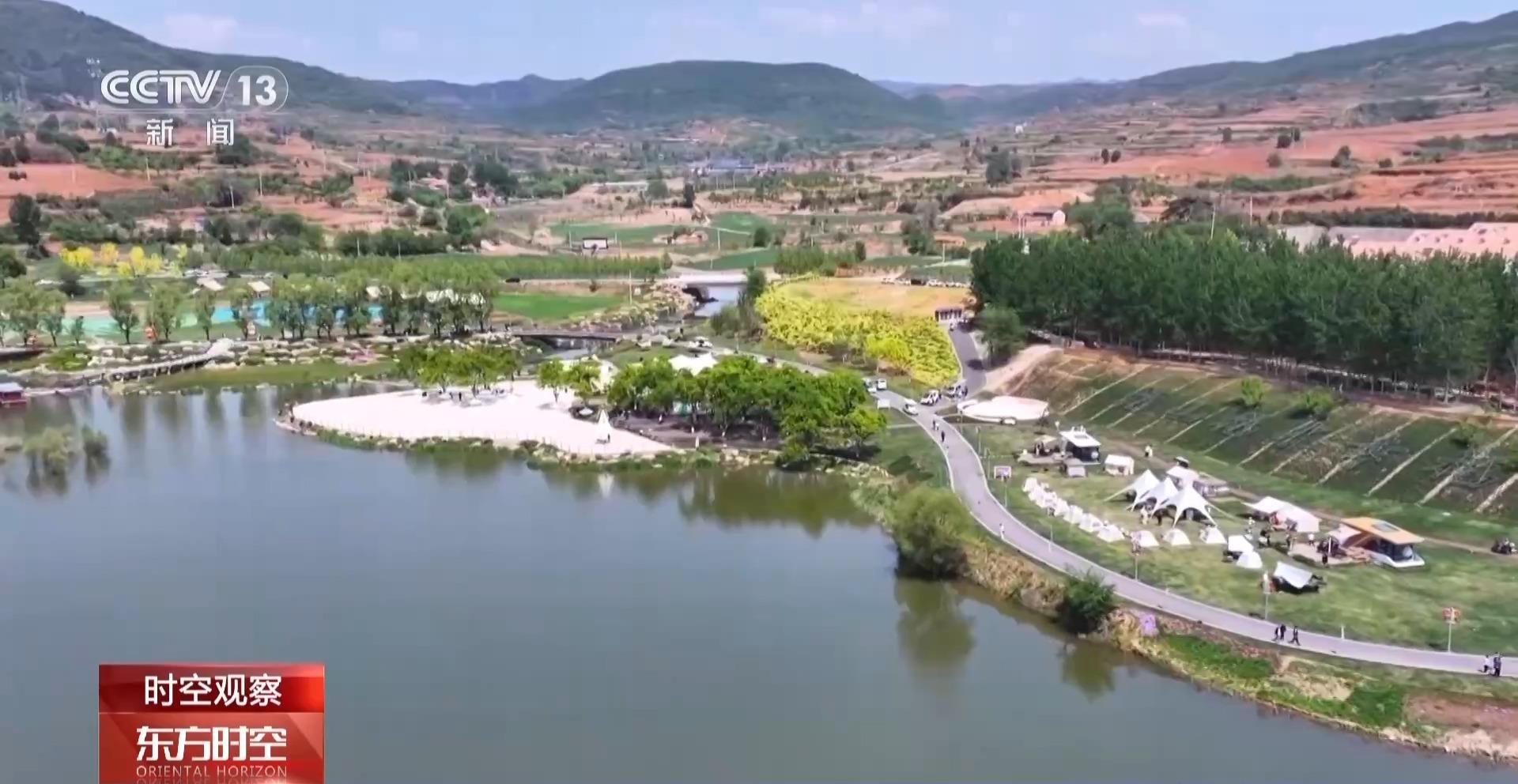 这里是山西高平釜山村的露营地,蓝天白云与绿地湖水相映成趣,露营帐篷错落有致,游客们或玩耍拍照,或在帐篷外烧烤,轻松惬意。