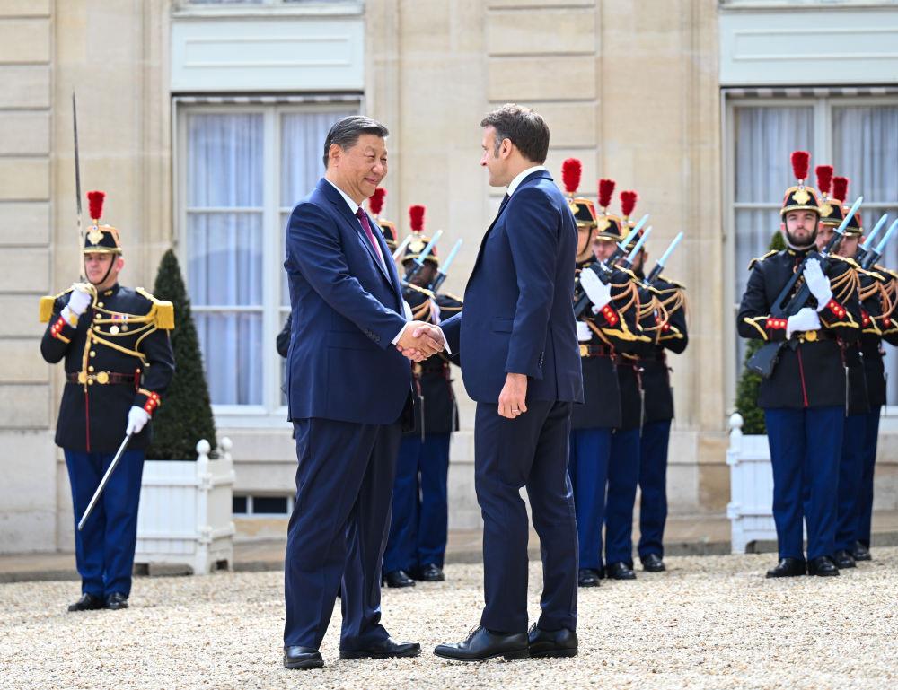 当地时间5月6日上午,国家主席习近平应邀在巴黎爱丽舍宫同法国总统马克龙、欧盟委员会主席冯德莱恩举行中法欧领导人三方会晤。这是习近平同马克龙握手。新华社记者 殷博古 摄