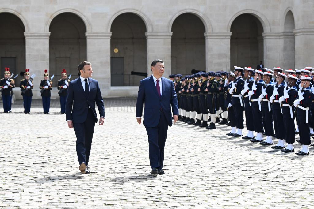 当天下午,习近平在巴黎出席马克龙举行的隆重盛大欢迎仪式。两国元首检阅法兰西共和国卫队和陆海空三军仪仗队,并观看分列式。