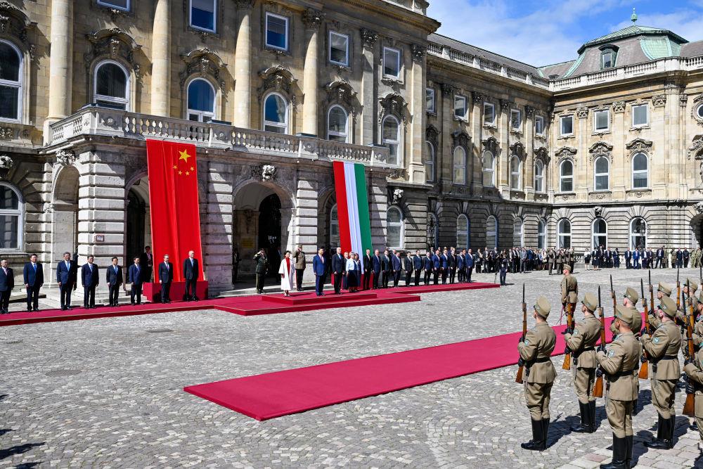 初夏时节的布达佩斯阳光明媚,古老宏伟的布达王宫庄严矗立,中匈两国国旗相映成辉。习近平和夫人彭丽媛乘坐的国宾车队在匈牙利礼宾马队护卫下缓缓驶入布达王宫内庭。舒尤克总统夫妇和欧尔班总理夫妇热情迎接。