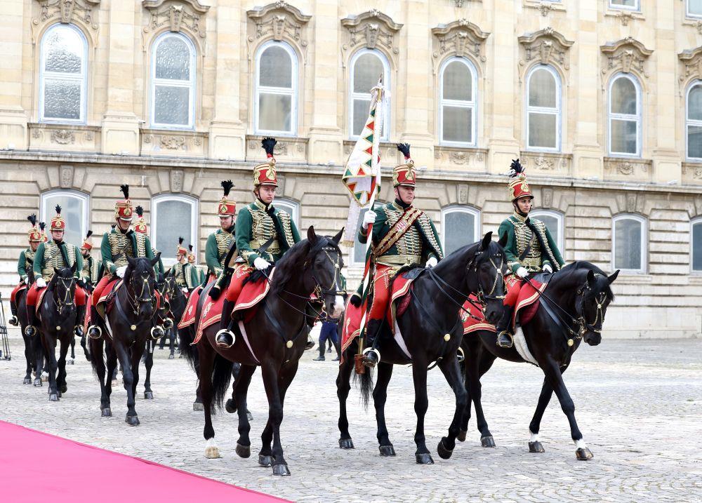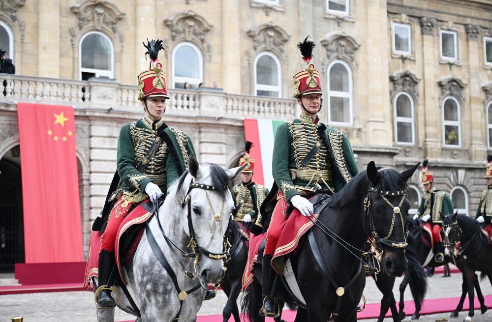 当地时间5月9日上午,国家主席习近平在布达佩斯出席匈牙利总统舒尤克和总理欧尔班共同举行的隆重欢迎仪式。习近平在舒尤克陪同下检阅国防军仪仗队和骑兵仪仗队。