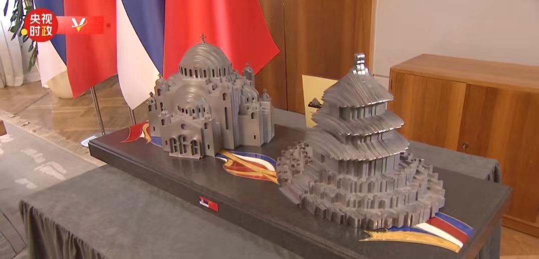 这份礼物是北京天坛和贝尔格莱德圣萨瓦教堂造型的钢制工艺品,由中国河钢集团斯梅戴雷沃钢厂生产的钢材制成。望着这份礼物,习主席风趣地说,是“钢杆”朋友了。