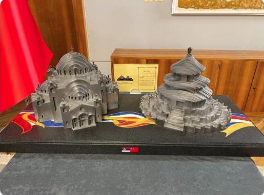 习近平主席送给武契奇两件工艺品,分别是钢材质的天坛和圣萨瓦教堂造型。
