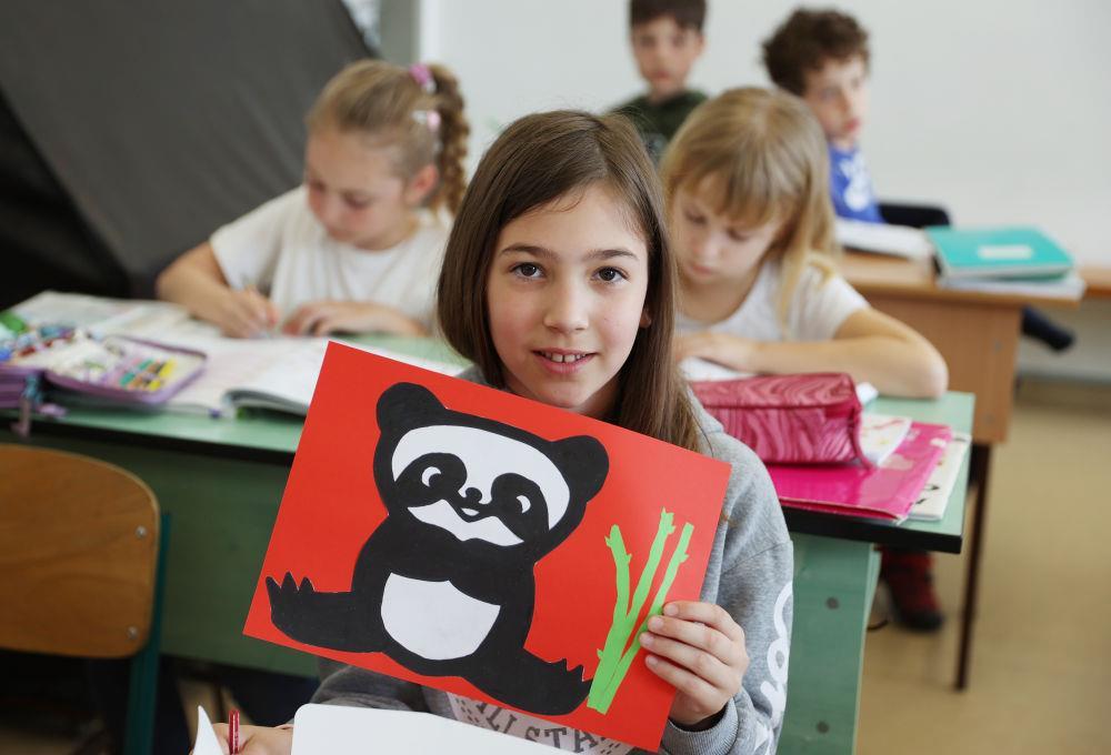 △2024年5月3日,匈中双语学校三年级学生宝怡展示自己的大熊猫形象美术作品。