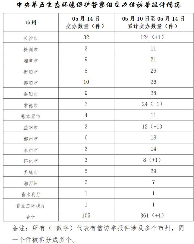 从交办的第五批信访件分布情况看,14个市州中,长沙市信访件最多,有31件;其次为邵阳市,有10件;湘潭市、岳阳市均有9件;衡阳市、常德市、郴州市、娄底市、张家界市分别有8件、7件、6件、5件、4件;益阳市、永州市、怀化市、株洲市均有3件;湘西土家族苗族自治州2件。除市州外,省水利厅、省生态环境厅各被交办信访件1件。