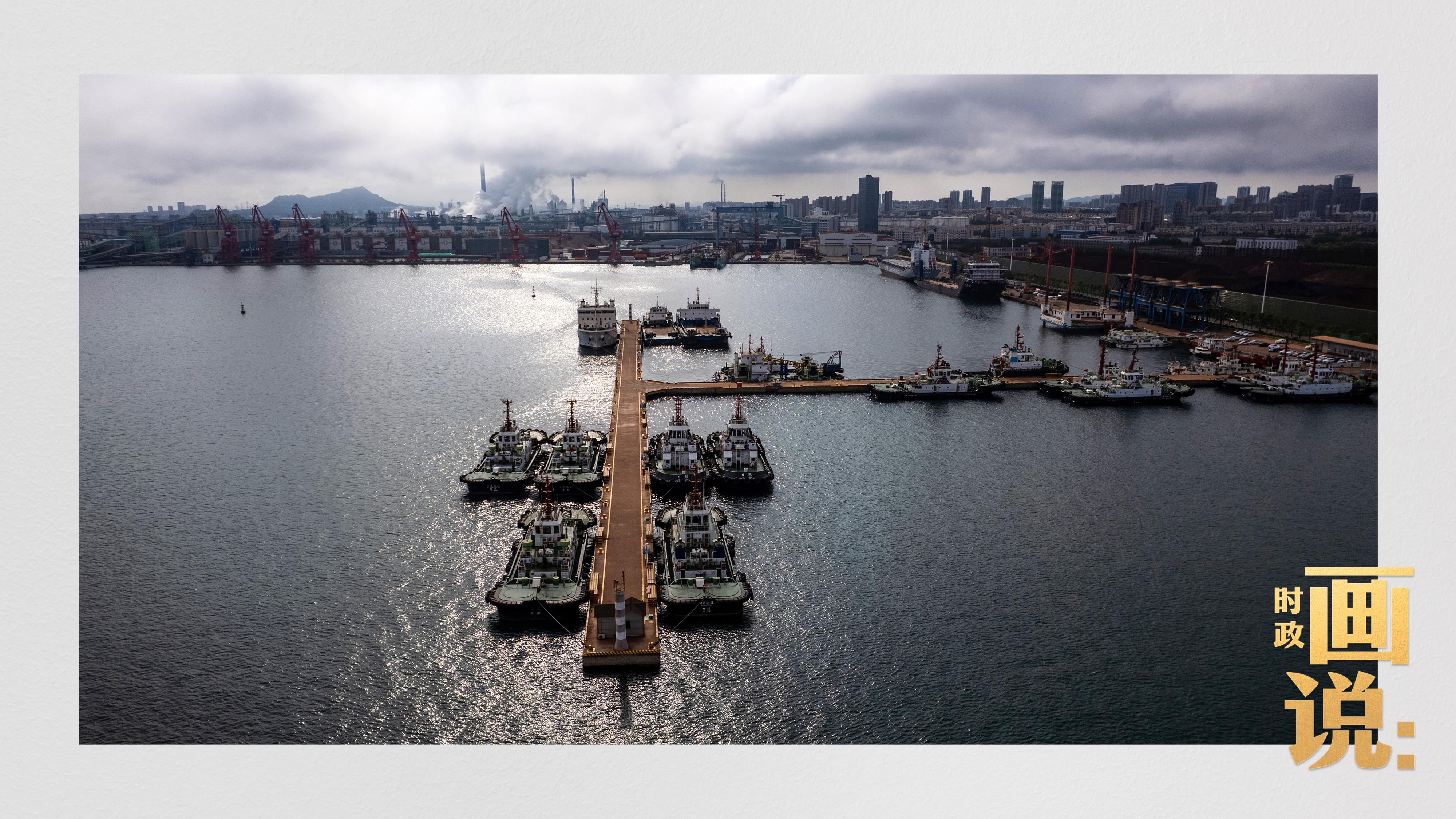 △阳光穿越云层,洒落在港区内待命的拖船码头。