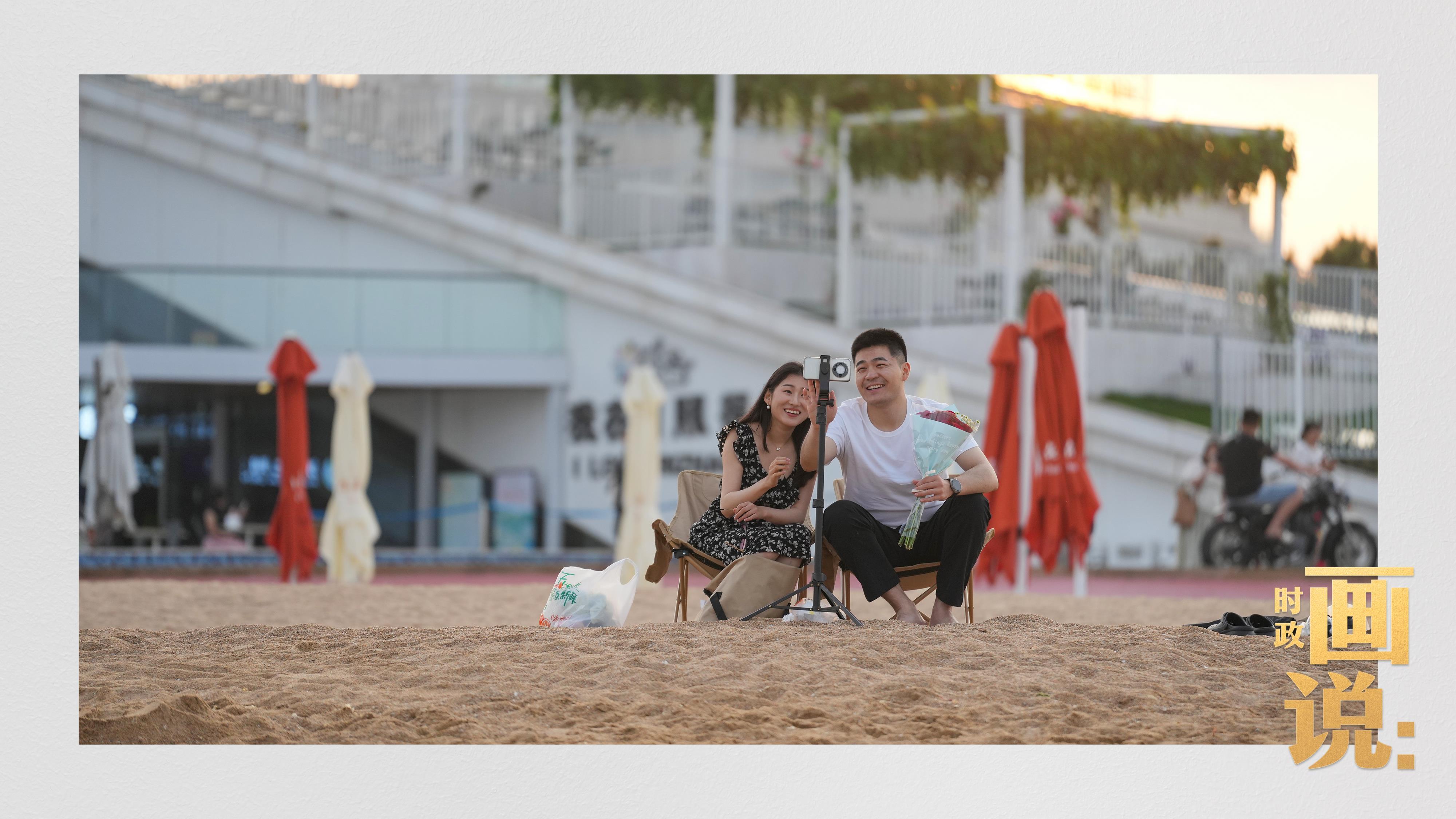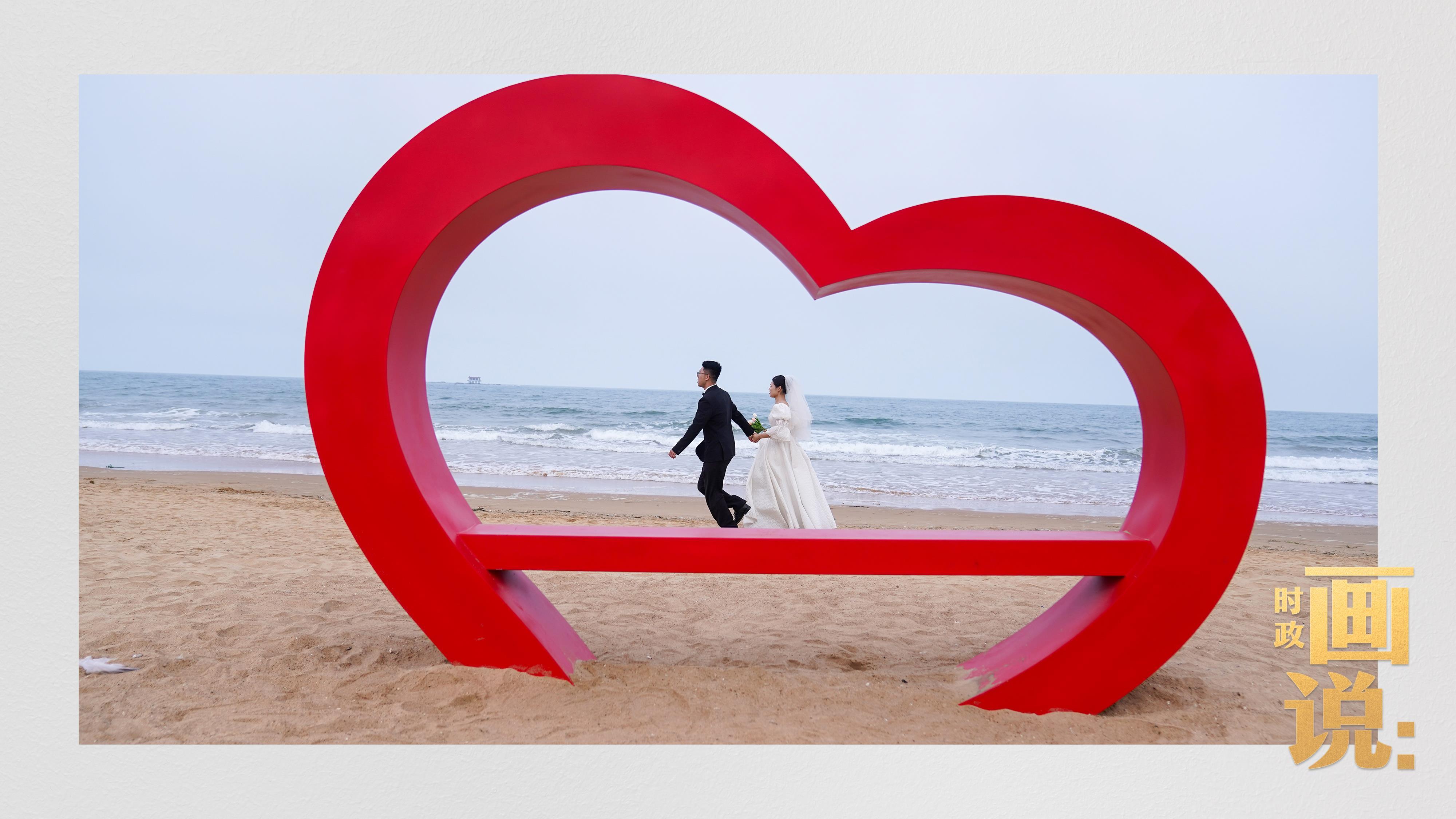 △日照阳光海岸绿道上的万平口景区,一对游客在海浪中翩然起舞。