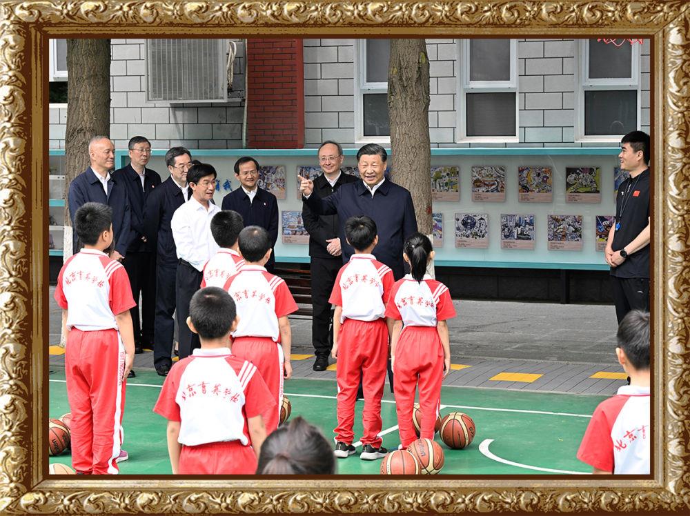 2023年5月31日上午,习近平总书记来到北京育英学校看望慰问师生,在篮球场同正在上体育课的小学生们亲切交流。习近平亲切地说:“现在生活条件好了,孩子们不是要吃得胖胖的,而是要长得壮壮的、练得棒棒的。”