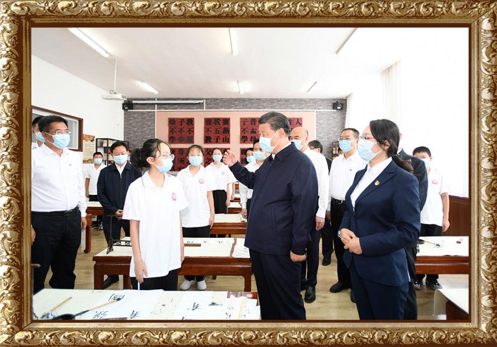 2021年9月13日至14日,习近平总书记在陕西省榆林市考察。14日上午,习近平在绥德实验中学考察时,同正在练习书法的学生亲切交流。