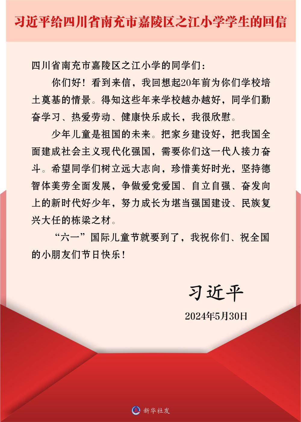 在“六一”国际儿童节即将到来之际,中共中央总书记、国家主席、中央军委主席习近平5月30日给四川省南充市嘉陵区之江小学的学生们回信,对他们予以亲切勉励,并祝他们和全国的少年儿童节日快乐。