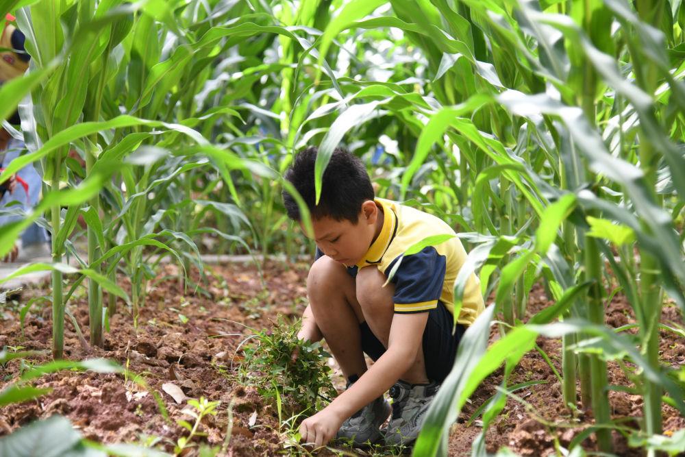 5月31日,学生在之江小学劳动实践基地除草。