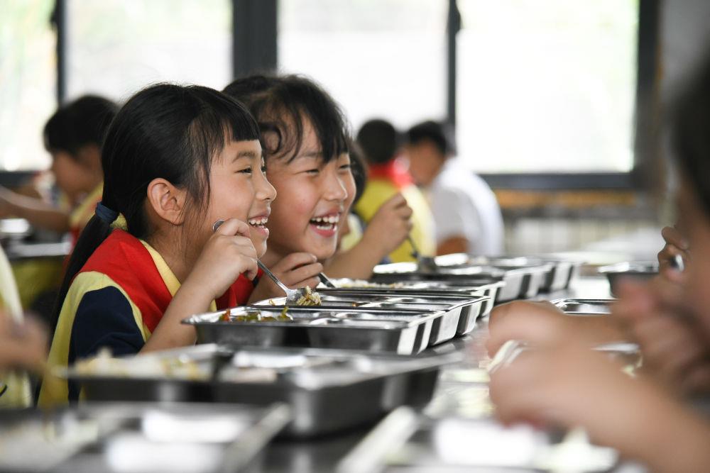 5月31日,学生在午餐时聊天。