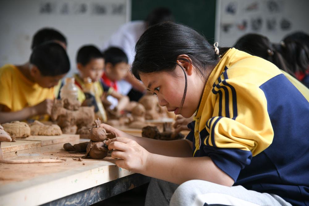 5月31日,学生在陶艺课上制作陶艺品。