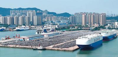 图为近日,出口汽车在烟台港整齐排列,等待装船。