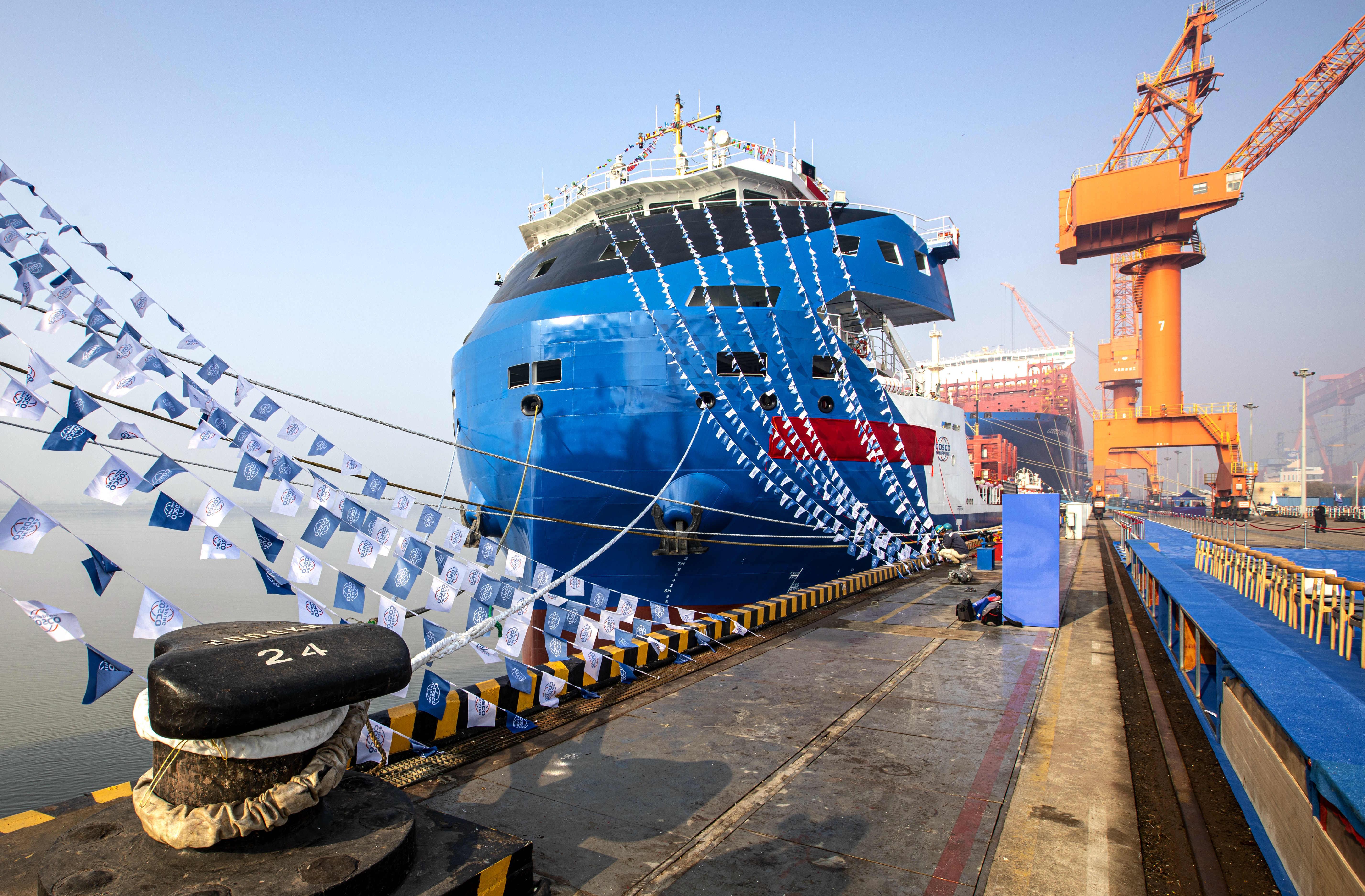 图为国产万吨级电动集装箱船“中远海运绿水01”