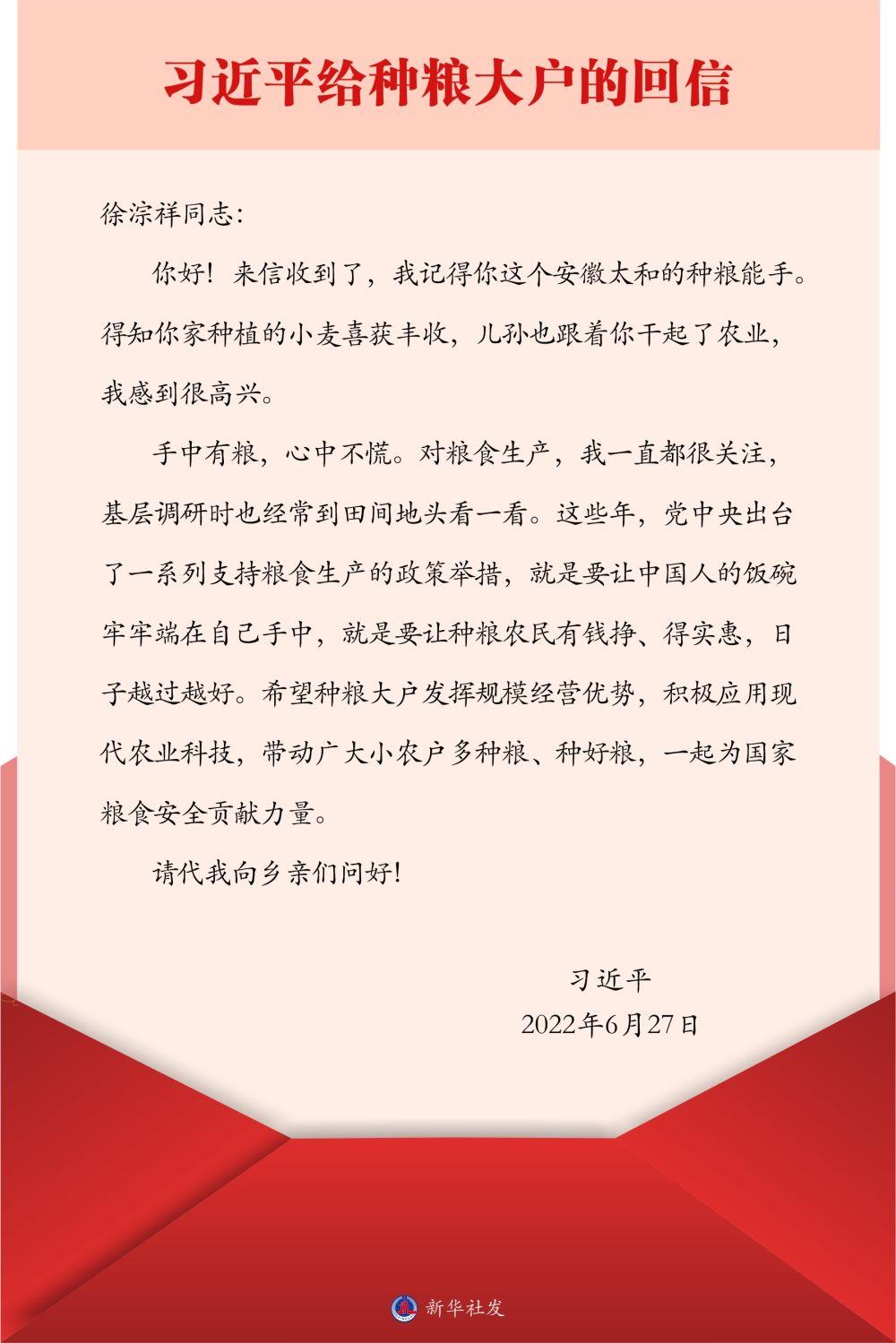 两年前的夏天,徐淙祥收到习近平总书记的回信。回信里,总书记勉励种粮大户发挥规模经营优势,积极应用现代农业科技,带动广大小农户多种粮、种好粮,一起为国家粮食安全贡献力量。