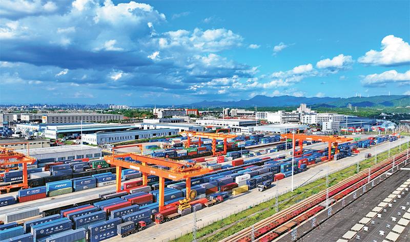 图为2024年5月5日,江西省赣州市南康区,赣州国际陆港车来车往、货如轮转,起重机在装卸进出口货物集装箱。 人民图片 朱海鹏/摄