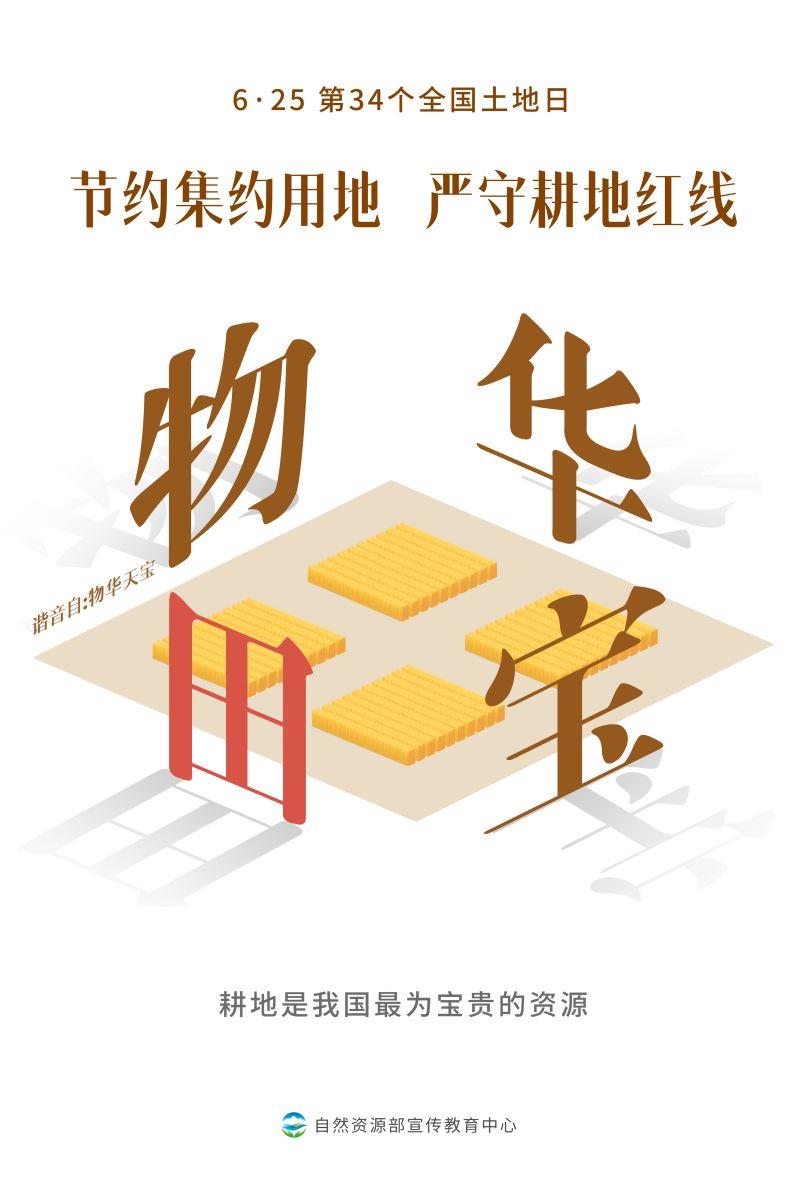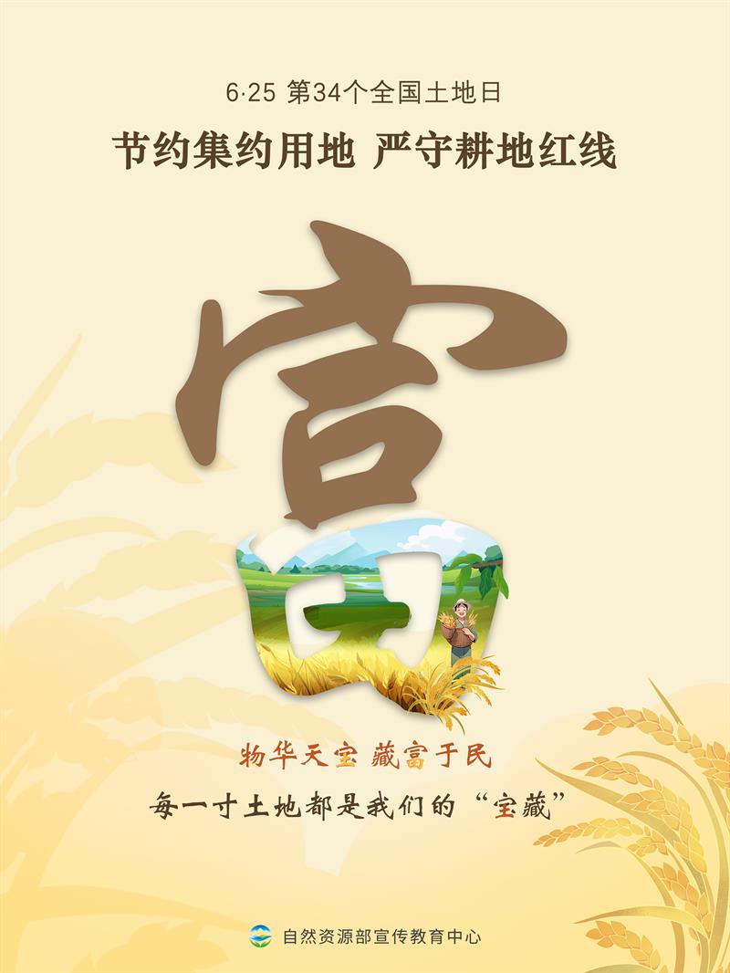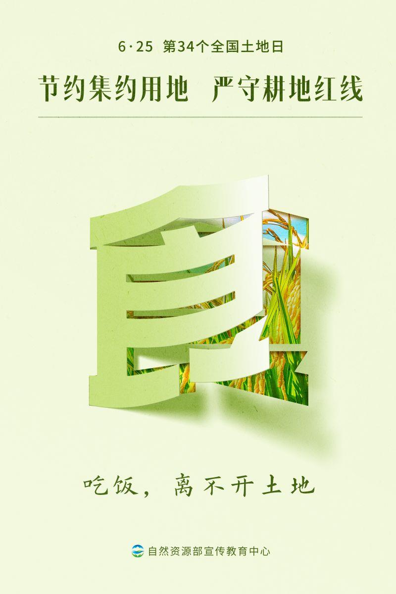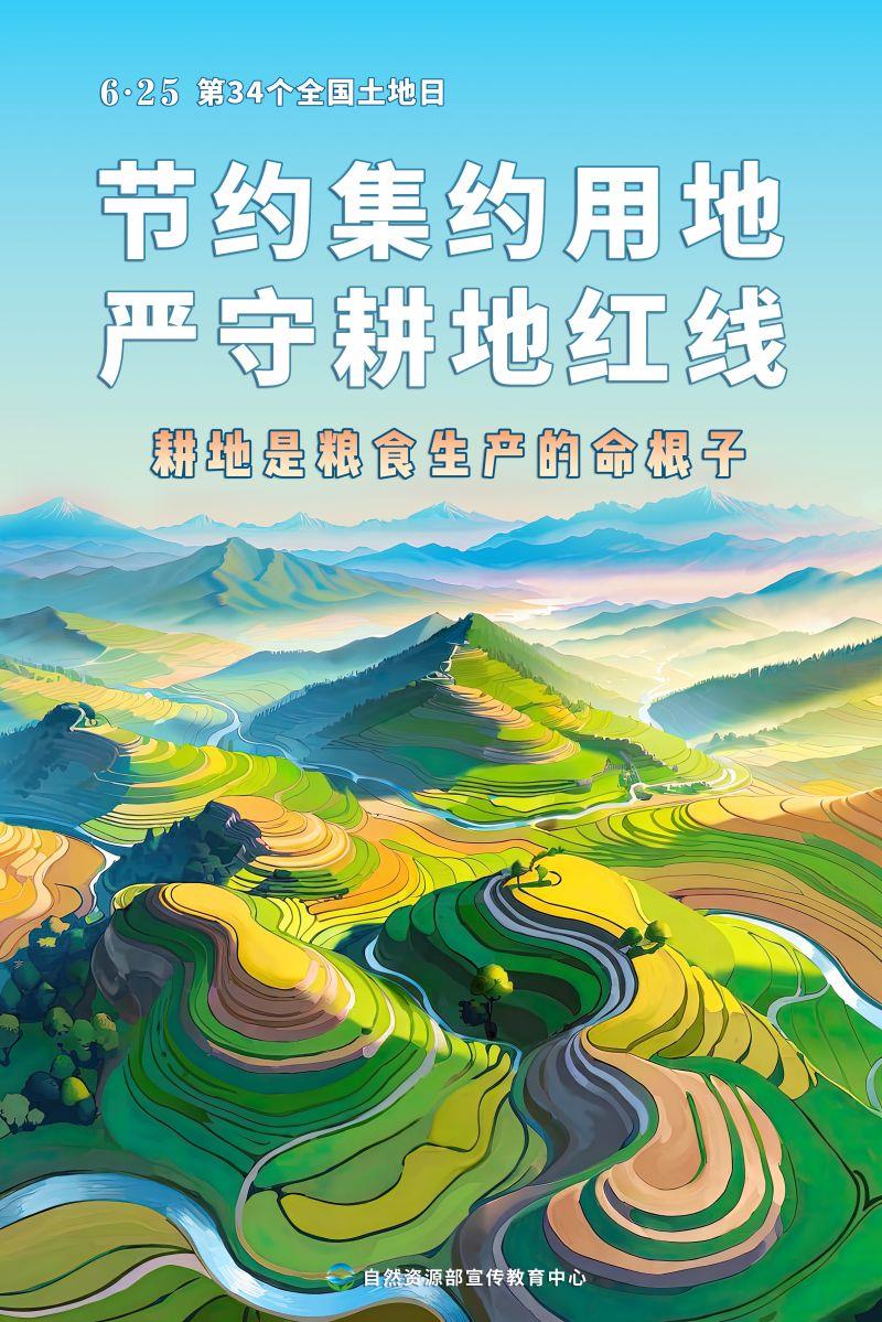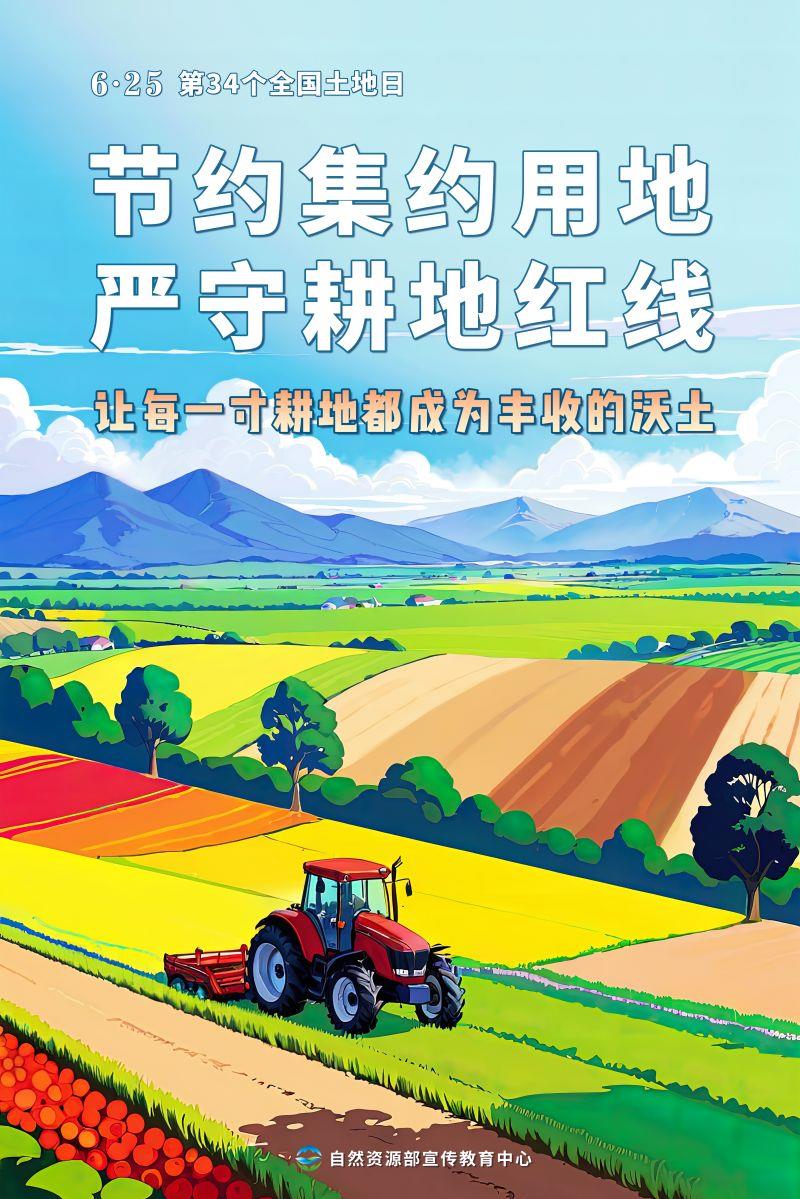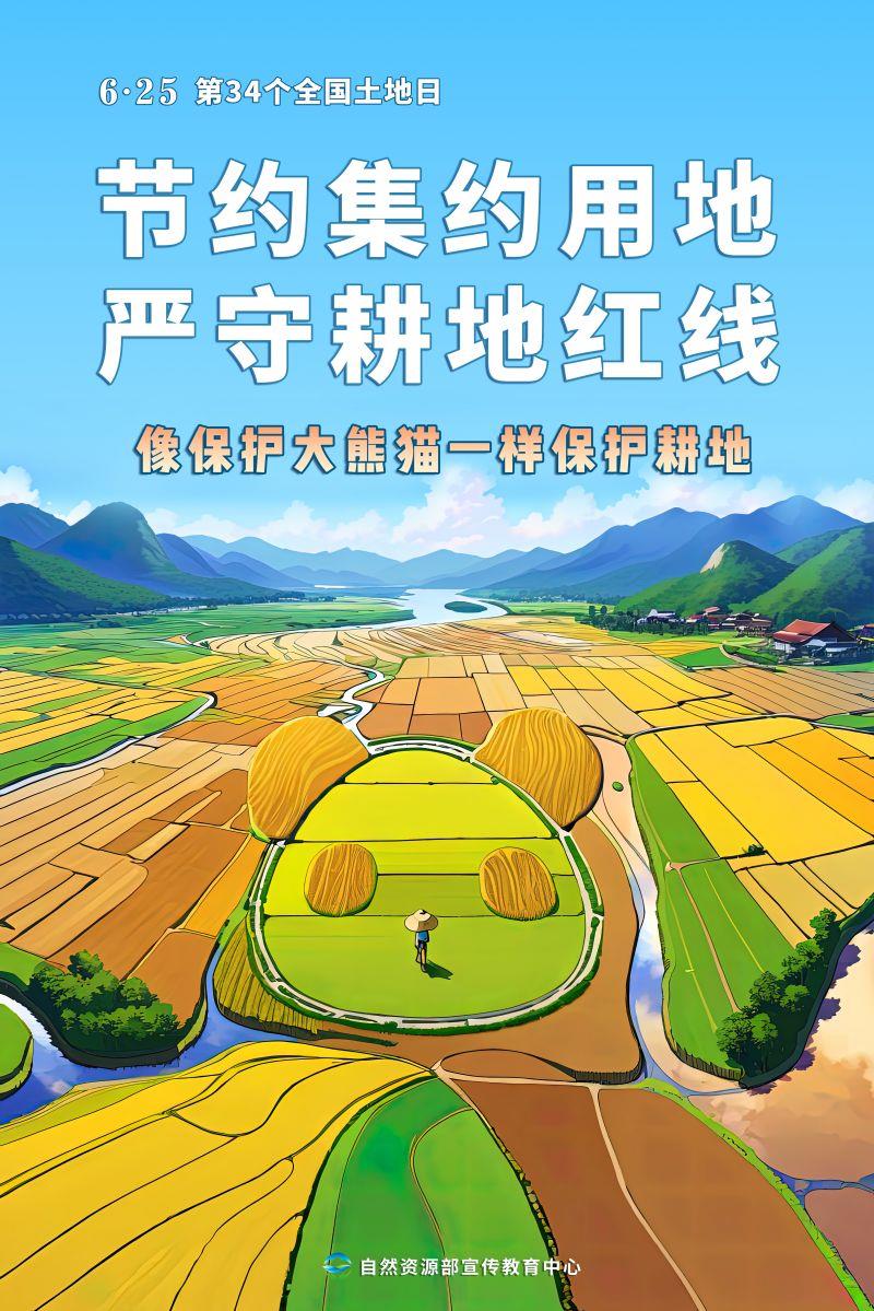 2024年6月25日是第34个全国土地日,活动主题是“节约集约用地 严守耕地红线”。为方便大家开展“耕地保护进万村”等各类线上线下活动,自然资源部宣传教育中心策划制作了多套不同风格的宣传海报,欢迎各地下载使用。希望全社会树立节约用地、保护耕地的意识,像保护大熊猫一样保护耕地,让每一寸土地都成为丰收的沃土。