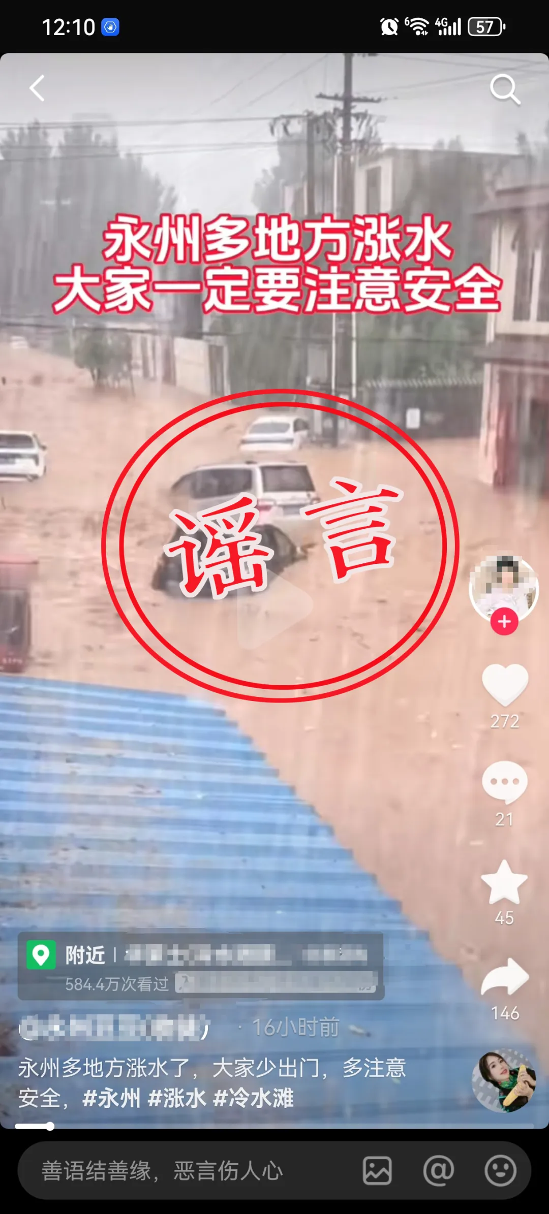 辟谣侠盟丨冷水滩区一网红为吸粉散布汛情谣言被行政处罚