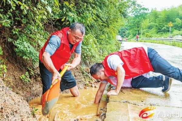 6月27日,东安县川岩乡白牙水村,党员志愿者在村道上疏浚涵管,确保道路畅通和群众出行安全。蔡小平 摄(湖南图片库)
