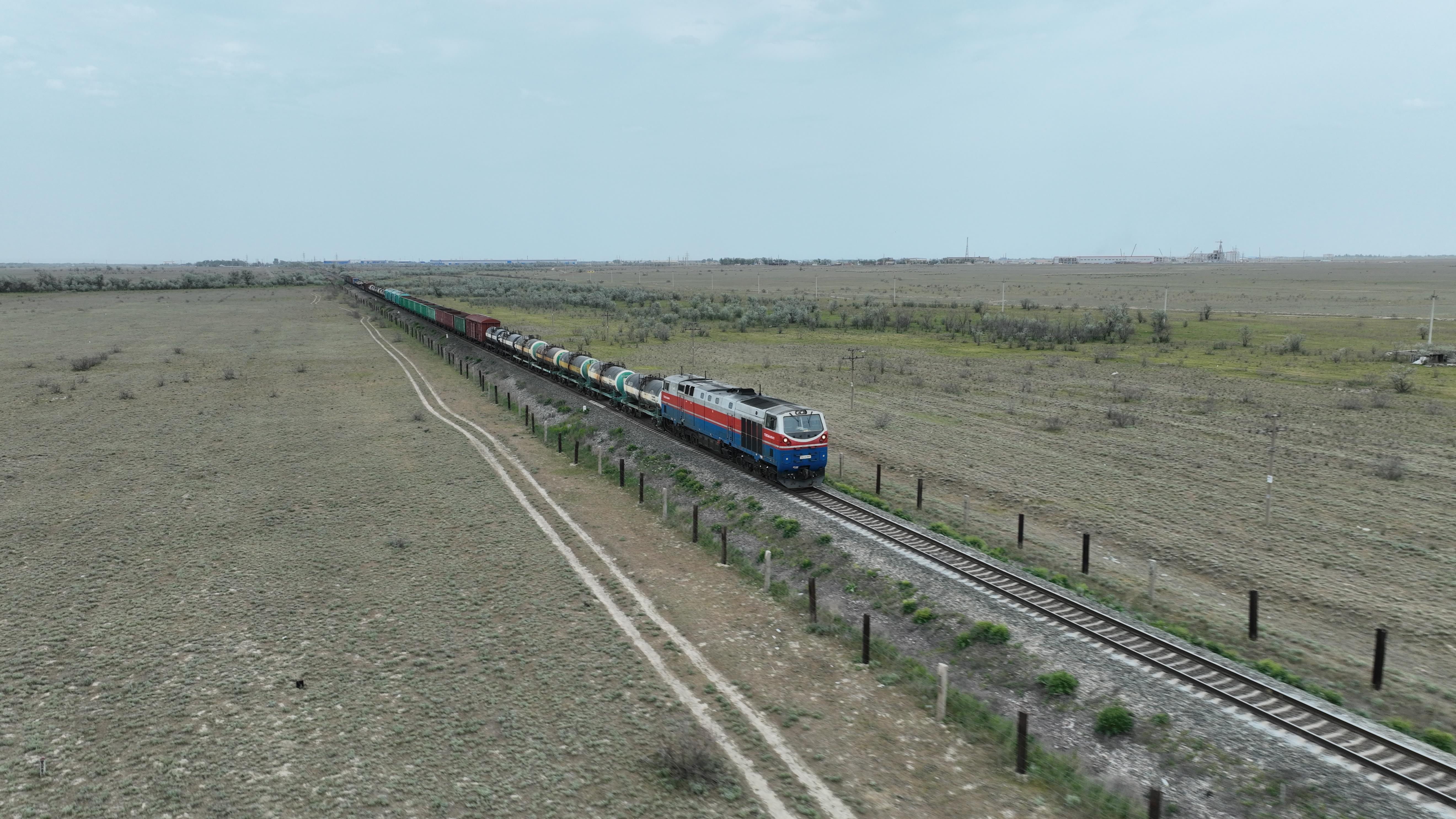 △ 2023年5月12日,在哈萨克斯坦阿拉木图附近,货运列车驰骋于阿拉木图与中国霍尔果斯间(无人机照片)。