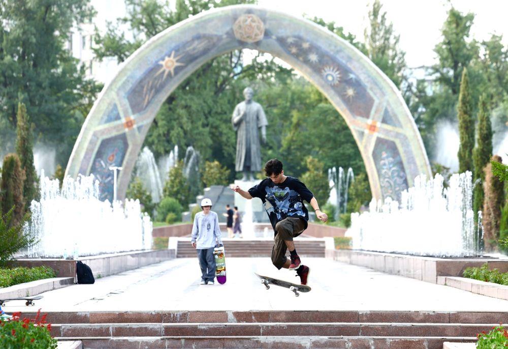 ↑青少年在杜尚别的鲁达基公园练习滑板。 新华社记者 姚大伟 摄