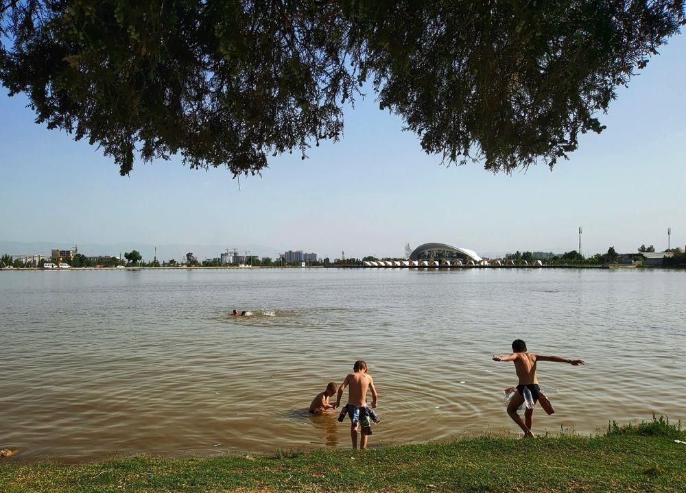 ↑几名儿童在杜尚别的纳乌鲁兹宫旁戏水。 新华社记者 燕雁 摄