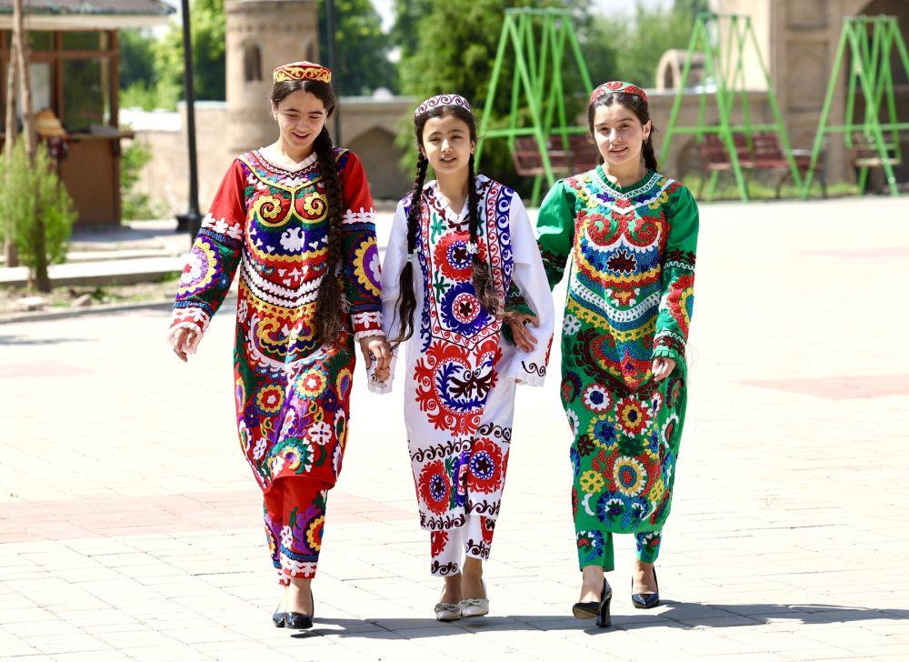 ↑身着当地特色服饰的女孩走在杜尚别街头。新华社记者 姚大伟 摄