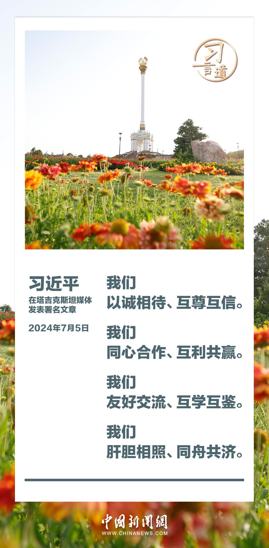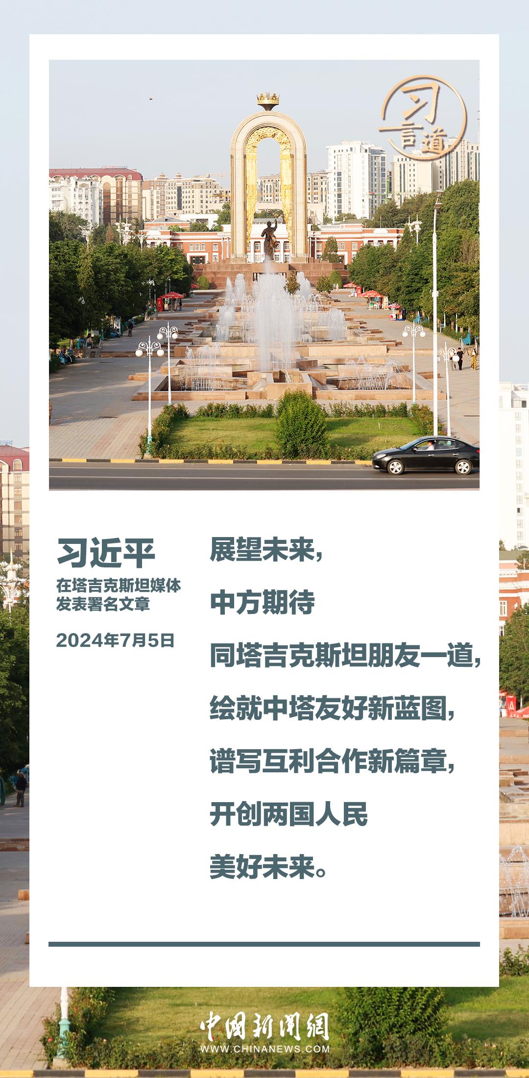 7月5日,在对塔吉克斯坦进行国事访问之际,国家主席习近平在塔吉克斯坦《人民报》和“霍瓦尔”国家通讯社发表题为《共创中塔关系美好明天》的署名文章。习近平指出——