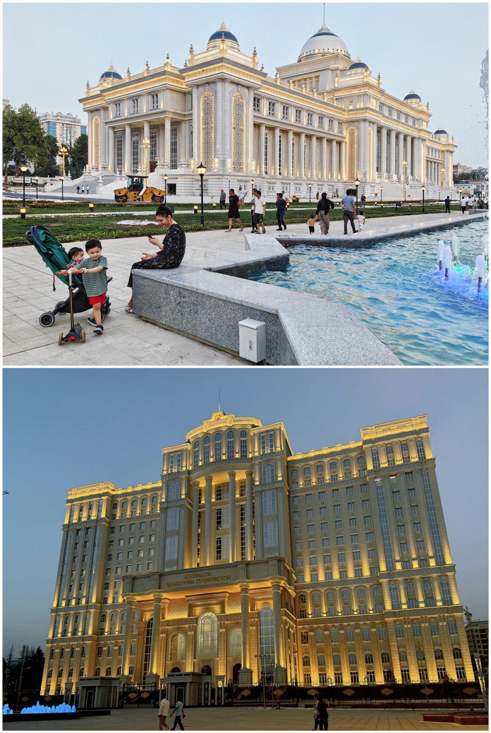 塔议会大楼、政府大楼坐落于杜尚别著名的鲁达基大道,相隔数百米。议会大楼同总统府相望,政府大楼则俯瞰杜尚别另一条交通干道——索莫尼大道。两座大楼融合欧亚古典柱廊结构、塔吉克民族特色雕刻、伊斯兰文化风格的设计,外观大气、典雅庄重,同鲁达基大道两侧的古树、鲜花、喷泉相映成景。