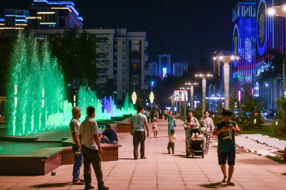 6月25日,在塔吉克斯坦首都杜尚别街头,入夜后当地居民带着孩子消暑纳凉。