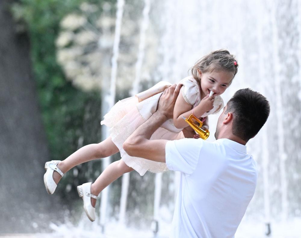 6月29日,在塔吉克斯坦首都杜尚别,一名男子在鲁达基公园内与孩子玩耍。