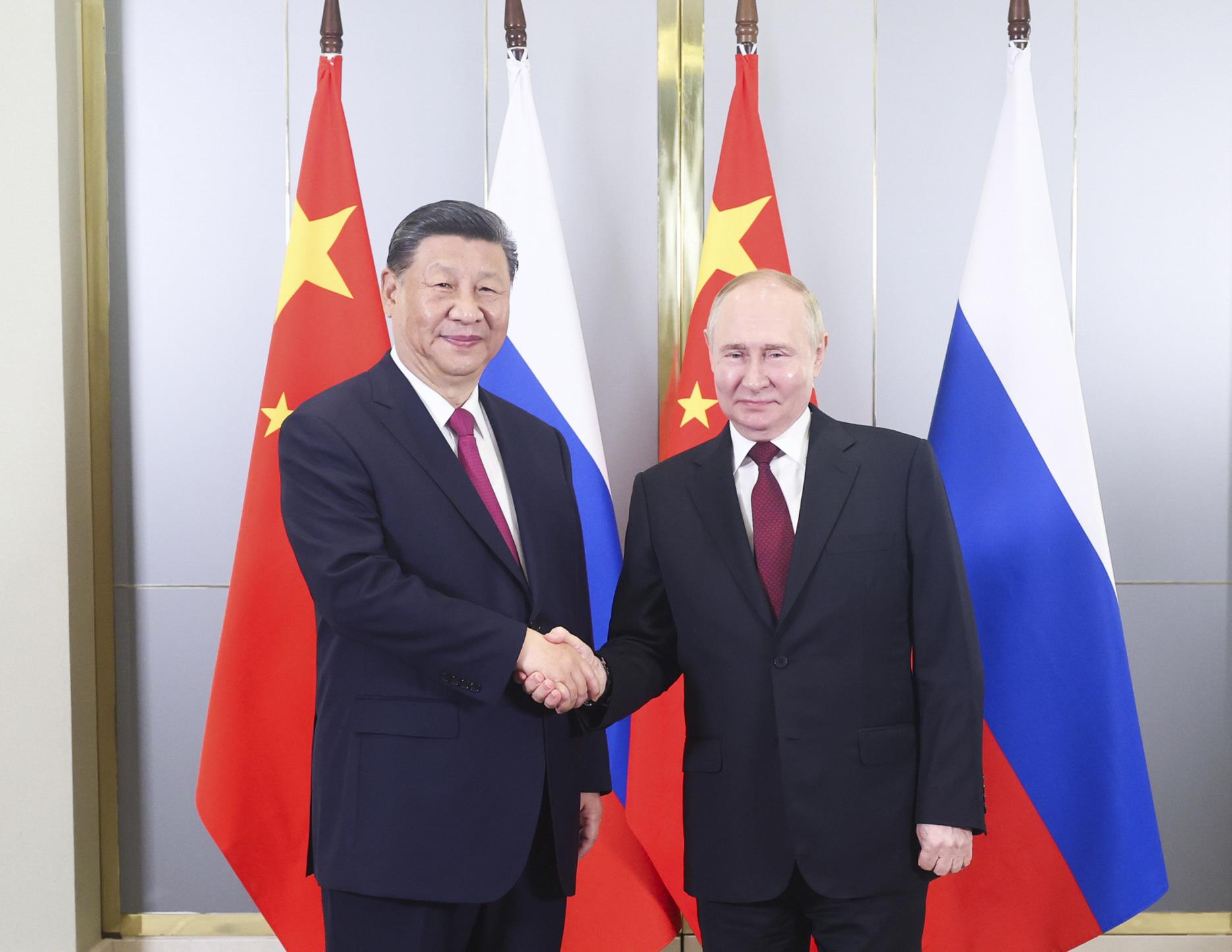 当地时间7月3日晚,国家主席习近平在阿斯塔纳出席上海合作组织峰会前会见俄罗斯总统普京。新华社记者 鞠鹏 摄