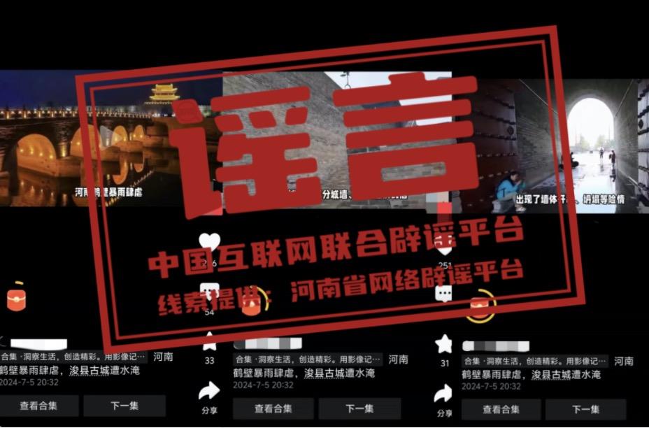 真相:近日,有网民在网络平台发布内容为“河南鹤壁暴雨肆虐,浚县古城遭水淹”的视频信息,引发社会关注。经核实,7月5日浚县出现暴雨天气,强降雨期间浚县古城北大街、东城门广场等处出现积水情况,经过积极排涝,雨停后路面积水很快被排空,恢复正常通行,不存在视频中所说的“古城风貌受损严重”“古城内的部分城墙、古街巷出现不同程度的损毁”“古城墙出现了墙体开裂、坍塌等险情”“古城内的博物馆、纪念馆等文化设施也遭受不同程度的损失”等现象。该视频多为当地旧闻及外地视频嫁接拼凑。目前,浚县古城秩序正常。(来源:河南省网络辟谣平台、浚县古城保护建设服务中心)