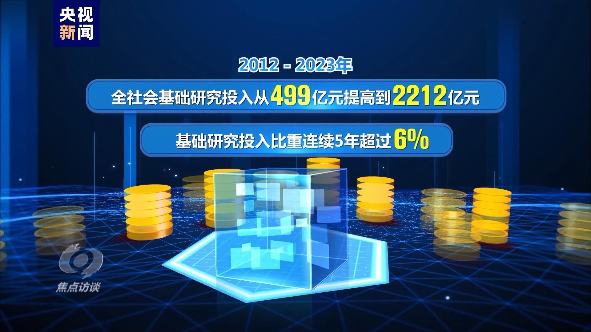 2012—2023年,全社会基础研究投入从499亿元提高到2212亿元,基础研究投入比重连续5年超过6%。