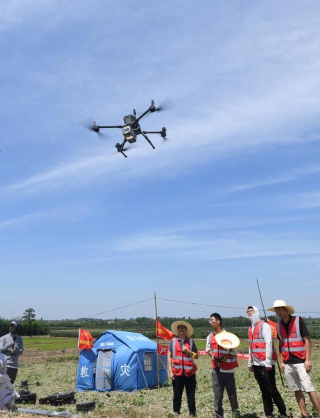 (7月7日,华容县钱团间堤上,应急管理部国家自然灾害防治研究院洞庭湖堤防应急智巡先锋队利用多种先进技术装备进行巡堤查险,实现对管涌、渗漏等堤防险情全方位、立体式巡测。 湖南日报全媒体记者 田超 摄)