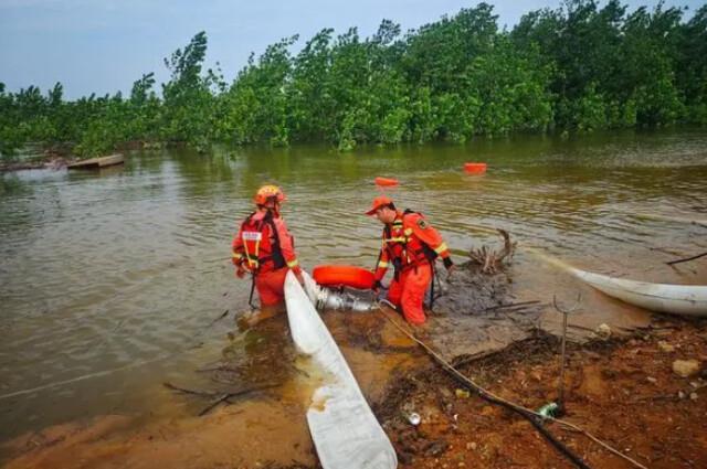 (7月9日,华容县洞庭湖一线堤坝,湖南消防救援队伍等排涝专业队在进行抽排积水作业。国家消防救援局调派湖北、重庆、贵州等地消防救援力量实施跨省区增援助力排涝。湖南日报全媒体记者 郭立亮 见习记者 童臻熙 摄)