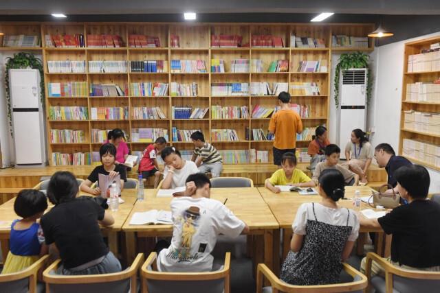 (7月8日,华容县实验小学安置点,青少年在家长陪伴下来到校园书屋阅读和自习。 湖南日报全媒体记者 徐行 摄)