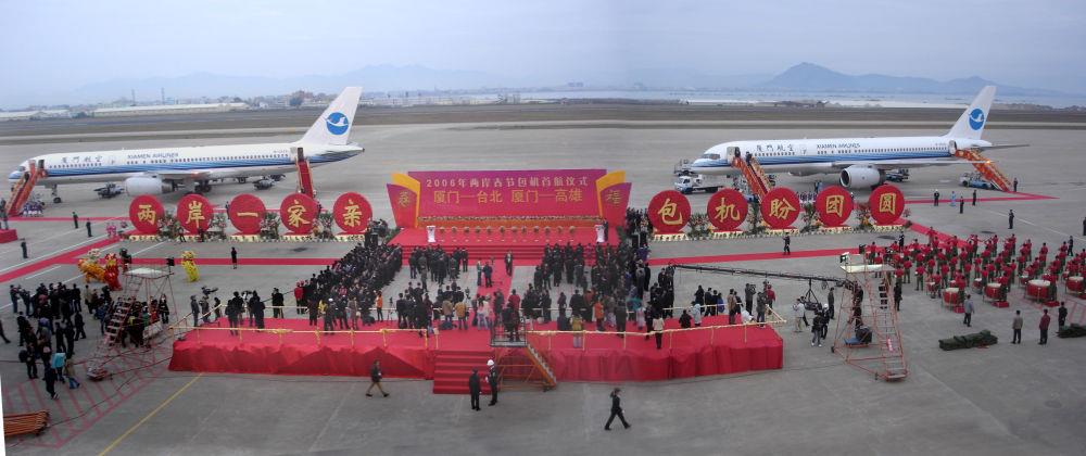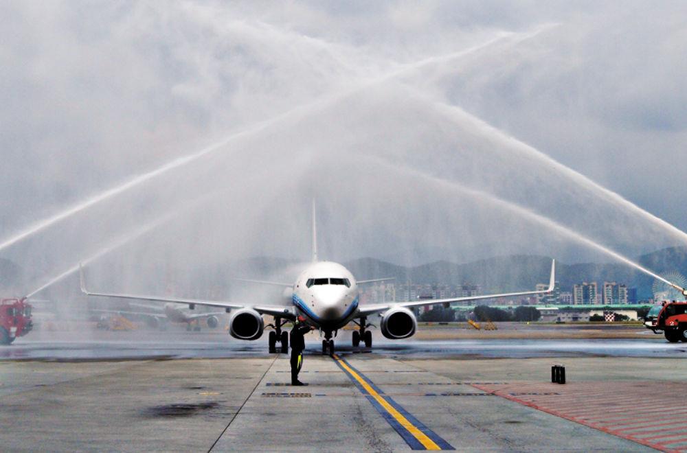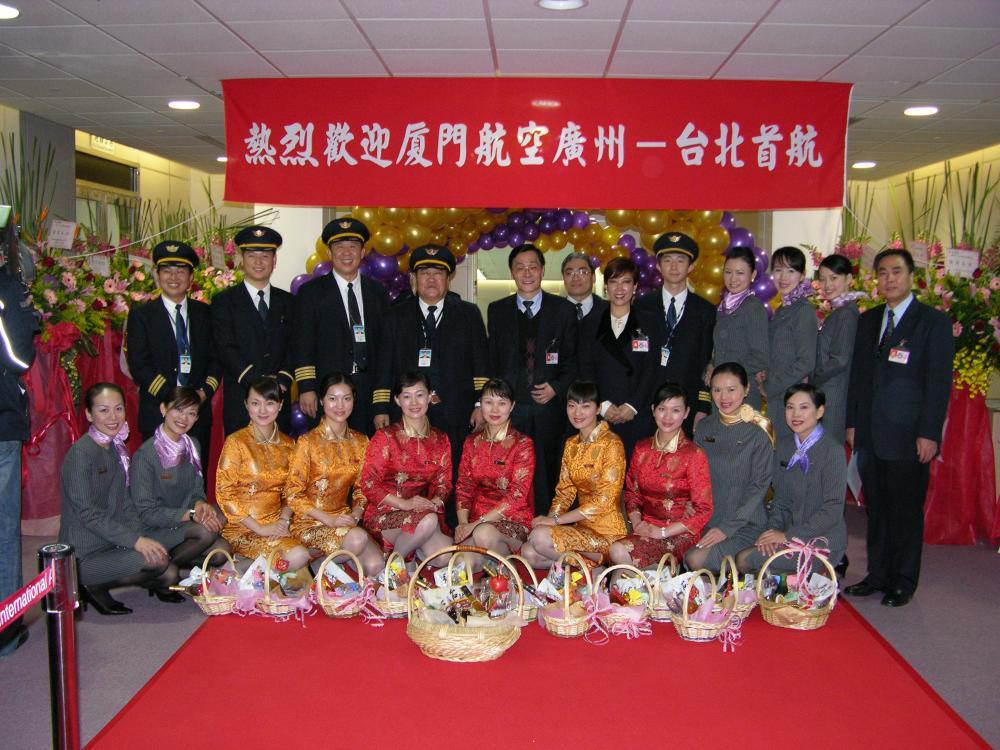 2005年,海峡两岸首次开放春节包机。这是2005年1月29日,厦航作为大陆6家参与台商春节包机直航的航空公司之一,圆满完成了广州-台北往返包机任务。这是厦航首航台北机组成员在台北与迎接人员亲切合影。 2006年,厦航作为新增厦门航点的唯一运营航空公司,执行了厦门-台北、厦门-高雄航线的包机任务。这是首航仪式现场。 2008年,两岸“三通”启动常态包机,厦航成为厦门、福州和杭州航点的运营航空公司。这是2008年12月15日,台北松山机场以“水门”仪式迎接厦航常态化包机。 2017年3月,厦航首次赴台北组织台籍乘务员专场招聘,吸引了2300名台湾青年踊跃应聘。这是2017年8月16日,首批台湾籍空中乘务员(右)接受欢迎鲜花。新华社记者 魏培全 摄 2018年8月16日,厦门航空有限公司百名台湾籍空中乘务员入职仪式在厦门举行。新华社记者 魏培全 摄