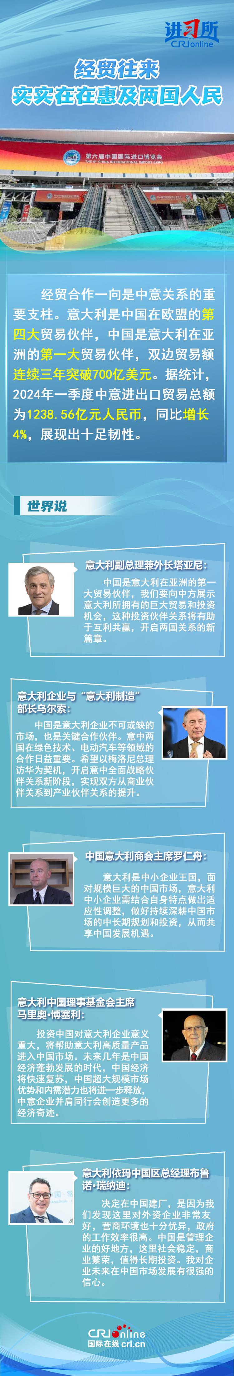 梅洛尼表示,中国对意大利而言是一个极为重要的经贸和文化合作伙伴。意大利各界人士认为,中意并肩同行会创造更多的经济奇迹,同时两国非常有必要开展文明对话,期待未来两国展开更多领域合作,开启全面战略伙伴关系新阶段。
