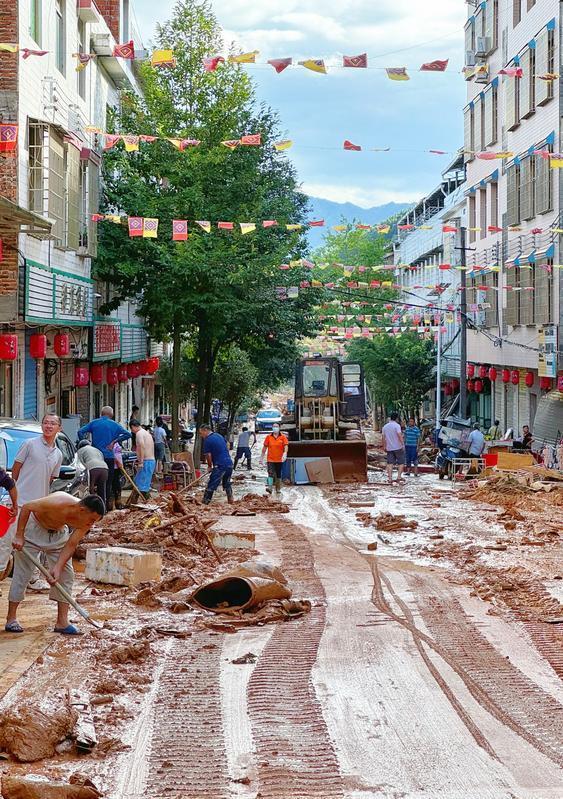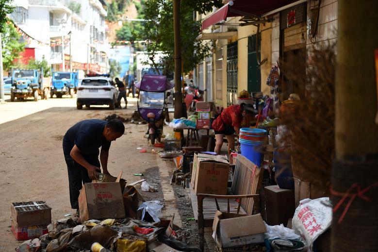7月30日,在资兴市八面山瑶族乡青腰村,村民在清理淤泥和垃圾。 新华社记者 陈振海 摄