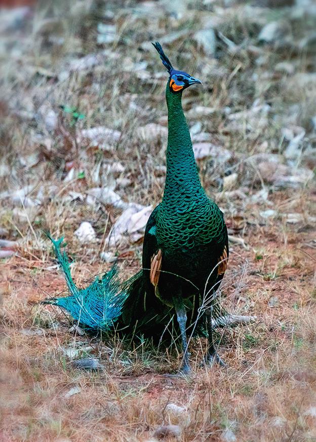 云南楚雄双柏县恐龙河自然保护区的绿孔雀(2023 年 4 月 20 日摄)胡超摄 / 本刊